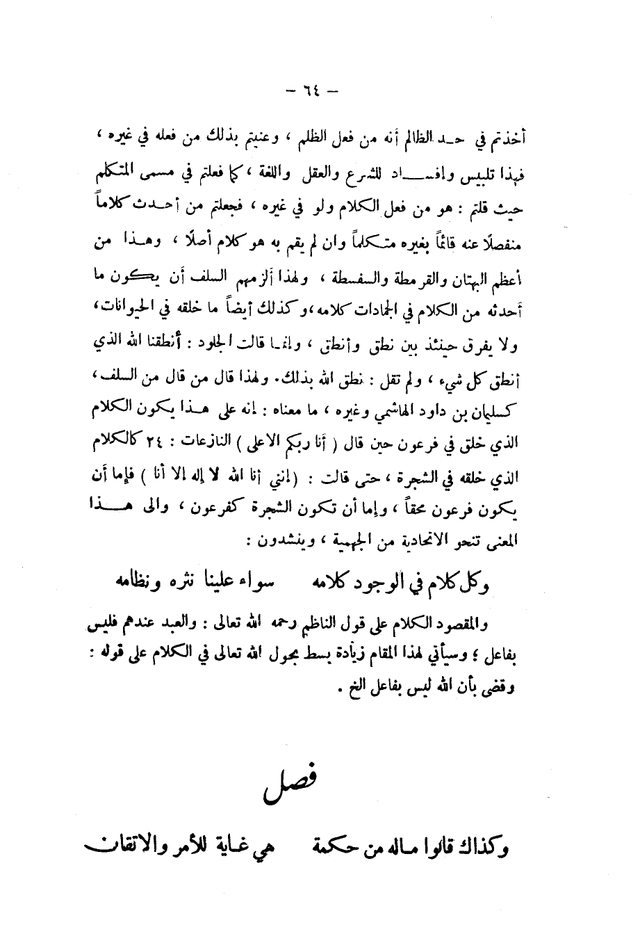 أَخَذْتُم فِي حد الظَّالِم أَنه من فعل الظُّلم وعنيتم بذلك من فعله فِي غَيره فَهَذَا تلبيس وإفساد للشَّرْع وَالْعقل واللغة كَمَا فَعلْتُمْ فِي مُسَمّى الْمُتَكَلّم حَيْثُ قُلْتُمْ هُوَ من فعل الْكَلَام وَلَو فِي غَيره فجعلتم من أحدث كلَاما مُنْفَصِلا عَنهُ قَائِما بِغَيْرِهِ متكلما وان لم يقم بِهِ هُوَ كَلَام أصلا وَهَذَا من أعظم الْبُهْتَان والقرمطة والسفسطة وَلِهَذَا ألزمهم السّلف أَن يكون مَا أحدثه من الْكَلَام فِي الجمادات كَلَامه وَكَذَلِكَ أَيْضا مَا خلقه فِي الْحَيَوَانَات وَلَا يفرق حِينَئِذٍ بَين نطق وأنطق وَإِنَّمَا قَالَت الْجُلُود أنطقنا الله الَّذِي أنطق كل شَيْء وَلم تقل نطق الله بذلك وَلِهَذَا قَالَ من قَالَ من السّلف كسليمان بن دَاوُد الْهَاشِمِي وَغَيره مَا مَعْنَاهُ إِنَّه على هَذَا يكون الْكَلَام الَّذِي خلق فِي فِرْعَوْن حِين قَالَ {أَنا ربكُم الْأَعْلَى} النازعات 24 كَالْكَلَامِ الَّذِي خلقه فِي الشَّجَرَة حَتَّى قَالَت {إِنَّنِي أَنا الله لَا إِلَه إِلَّا أَنا} فإمَّا أَن يكون فِرْعَوْن محقا وَإِمَّا أَن تكون الشَّجَرَة كفرعون والى هَذَا الْمَعْنى تنحو الاتحادية من الْجَهْمِية وينشدون