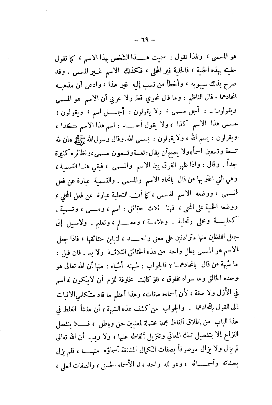هُوَ الْمُسَمّى وَلِهَذَا تَقول سميت هَذَا الشَّخْص بِهَذَا الِاسْم كَمَا تَقول حليته بِهَذِهِ الْحِلْية فالحلية غير الْمحلى فَكَذَلِك الِاسْم غير الْمُسَمّى وَقد صرح بذلك سِيبَوَيْهٍ وَأَخْطَأ من نسب إِلَيْهِ غير هَذَا وَادّعى أَن مذْهبه اتحادهما قَالَ النَّاظِم وَمَا قَالَ نحوي قطّ وَلَا عَرَبِيّ ان الِاسْم هُوَ الْمُسَمّى وَيَقُولُونَ أجل مُسَمّى وَلَا يَقُولُونَ أجل اسْم وَيَقُولُونَ مُسَمّى هَذَا الِاسْم كَذَا وَلَا يَقُول أحد اسْم هَذَا الِاسْم كَذَا وَيَقُولُونَ بِسم الله وَلَا يَقُولُونَ بمسمى الله وَقَالَ رَسُول الله صلى الله عَلَيْهِ وَسلم (إِن لله تِسْعَة وَتِسْعين اسْما (وَلَا يَصح أَن يُقَال تِسْعَة وَتسْعُونَ مُسَمّى ونظائره كَثِيرَة جدا وَقَالَ واذا ظهر الْفرق بَين الِاسْم والمسمى فَبَقيَ هُنَا التَّسْمِيَة وَهِي الَّتِي اغْترَّ بهَا من قَالَ باتحاد الِاسْم والمسمى وَالتَّسْمِيَة عبارَة عَن فعل الْمُسَمّى وَوَضعه الِاسْم للمسمى كَمَا أَن التحلية عبارَة عَن فعل الْمحلي وَوَضعه الْحِلْية على الْمحلى فَهُنَا ثَلَاث حقائق اسْم ومسمى وَتَسْمِيَة كحلية ومحلى وتحلية وعلامة ومعلم وَتَعْلِيم وَلَا سَبِيل إِلَى جعل اللَّفْظَيْنِ مِنْهَا مترادفين على معنى وَاحِد لتباين حقائقها فاذا جعل الِاسْم هُوَ الْمُسَمّى بَطل وَاحِد من هَذِه الْحَقَائِق الثَّلَاثَة ولابد فان قيل مَا شُبْهَة من قَالَ باتحادهما فَالْجَوَاب شبهته أَشْيَاء مِنْهَا أَن الله تَعَالَى هُوَ وَحده الْخَالِق وَمَا سواهُ مَخْلُوق فَلَو كَانَت مخلوقة للَزِمَ أَن لَا يكون لَهُ اسْم فِي الازل وَلَا صفة لَان أسماءه صِفَات وَهَذَا أعظم مَا قاد متكلمي الاثبات الى القَوْل باتحادهما وَالْجَوَاب عَن كشف هَذِه الشُّبْهَة أَن منشأ الْغَلَط فِي هَذَا الْبَاب من إِطْلَاق أَلْفَاظ مجملة مُحْتَملَة لمعنيين حق وباطل فَلَا ينْفَصل النزاع الا بتفصيل تِلْكَ الْمعَانِي وتنزيل أَلْفَاظه عَلَيْهَا وَلَا ريب أَن الله تَعَالَى لم يزل وَلَا يزَال مَوْصُوفا بِصِفَات الْكَمَال المشتقة أسماؤه مِنْهَا فَلم يزل بصفاته وأسمائه وَهُوَ إِلَه وَاحِد لَهُ الاسماء الْحسنى وَالصِّفَات العلى