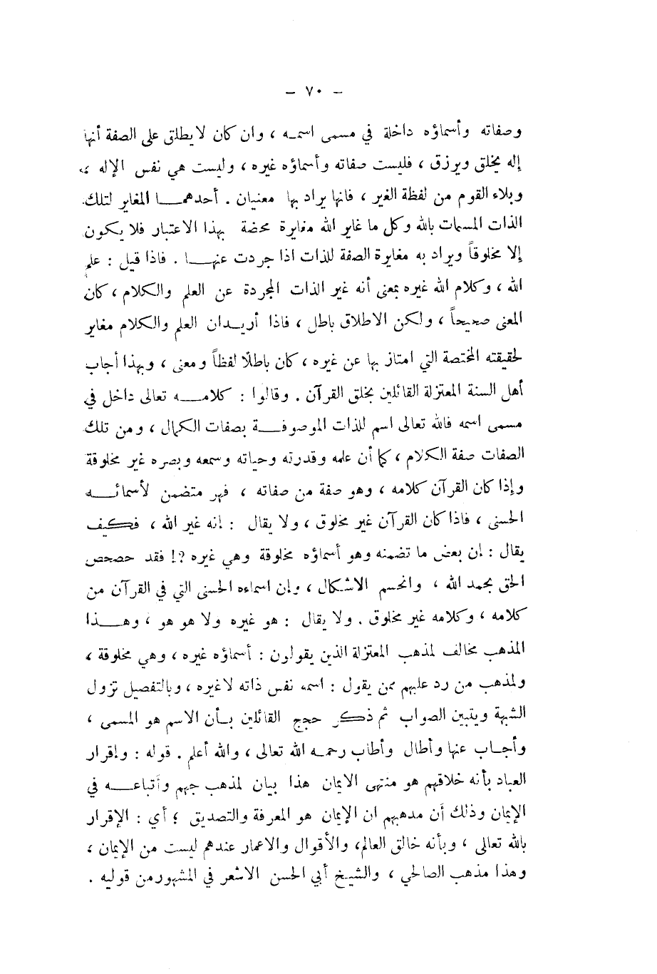 وَصِفَاته وأسماؤه دَاخِلَة فِي مُسَمّى اسْمه وان كَانَ لَا يُطلق على الصّفة أَنَّهَا إِلَه يخلق ويرزق فَلَيْسَتْ صِفَاته وأسماؤه غَيره وَلَيْسَت هِيَ نفس الاله وبلاء الْقَوْم من لَفظه الْغَيْر فانها يُرَاد بهَا مَعْنيانِ أَحدهمَا المغاير لتِلْك الذَّات المسمات بِاللَّه وكل مَا غاير الله مُغَايرَة مَحْضَة بِهَذَا الِاعْتِبَار فَلَا يكون الا مخلوقا وَيُرَاد بِهِ مُغَايرَة الصّفة للذات اذا جردت عَنْهَا فاذا قيل علم الله وَكَلَام الله غَيره بِمَعْنى أَنه غير الذَّات الْمُجَرَّدَة عَن الْعلم وَالْكَلَام كَانَ الْمَعْنى صَحِيحا وَلَكِن الاطلاق بَاطِل فاذا اريدان الْعلم وَالْكَلَام مُغَاير لحقيقتة المختصة الَّتِي امتاز بهَا عَن غَيره كَانَ بَاطِلا لفظا وَمعنى وَبِهَذَا أجَاب اهل السّنة الْمُعْتَزلَة الْقَائِلين بِخلق الْقُرْآن وَقَالُوا كَلَامه تَعَالَى دَاخل فِي مُسَمّى اسْمه فَالله تَعَالَى اسْم للذات الموصوفة بِصِفَات الْكَمَال وَمن تِلْكَ الصِّفَات صفة الْكَلَام كَمَا أَن علمه وَقدرته وحياته ومسمعه وبصره غير مخلوقة وَإِذا كَانَ الْقُرْآن كَلَامه وَهُوَ صفة من صِفَاته فَهُوَ مُتَضَمّن لاسمائه الْحسنى فاذا كَانَ الْقُرْآن غير مَخْلُوق وَلَا يُقَال انه غير الله فَكيف يُقَال ان بعض مَا تضمنه وَهُوَ أمساؤه مخلوقة وَهِي غَيره فقد حصحص الْحق بِحَمْد الله وانحسم الاشكال وَإِن اسماءه الْحسنى الَّتِي فِي الْقُرْآن من كَلَامه وَكَلَامه غير مَخْلُوق وَلَا يُقَال هُوَ غَيره وَلَا هُوَ هُوَ وَهَذَا الْمَذْهَب مُخَالف لمَذْهَب الْمُعْتَزلَة الَّذين يَقُولُونَ أسماؤه غَيره وَهِي مخلوقة ولمذهب من رد عَلَيْهِم مِمَّن يَقُول اسْمه نفس ذَاته لَا غَيره وبالتفصيل تَزُول الشُّبْهَة ويتبين الصَّوَاب ثمَّ ذكر حجج الْقَائِلين بِأَن الِاسْم هُوَ الْمُسَمّى وَأجَاب عَنْهَا وَأطَال وأطاب رَحمَه الله تَعَالَى وَالله أعلم قَوْله وَإِقْرَار الْعباد بِأَنَّهُ خلاقهم هُوَ مُنْتَهى الايمان هَذَا بَيَان لمَذْهَب جهم واتباعه فِي الايمان وَذَلِكَ أَن مَذْهَبهم ان الايمان هُوَ الْمعرفَة والتصديق أَي الاقرار بِاللَّه تَعَالَى وَبِأَنَّهُ خَالق الْعَالم والاقوال والاعمار عِنْدهم لَيست من الايمان وَهَذَا مَذْهَب الصَّالِحِي وَالشَّيْخ ابي الْحسن الاشعر فِي الْمَشْهُور من قوليه