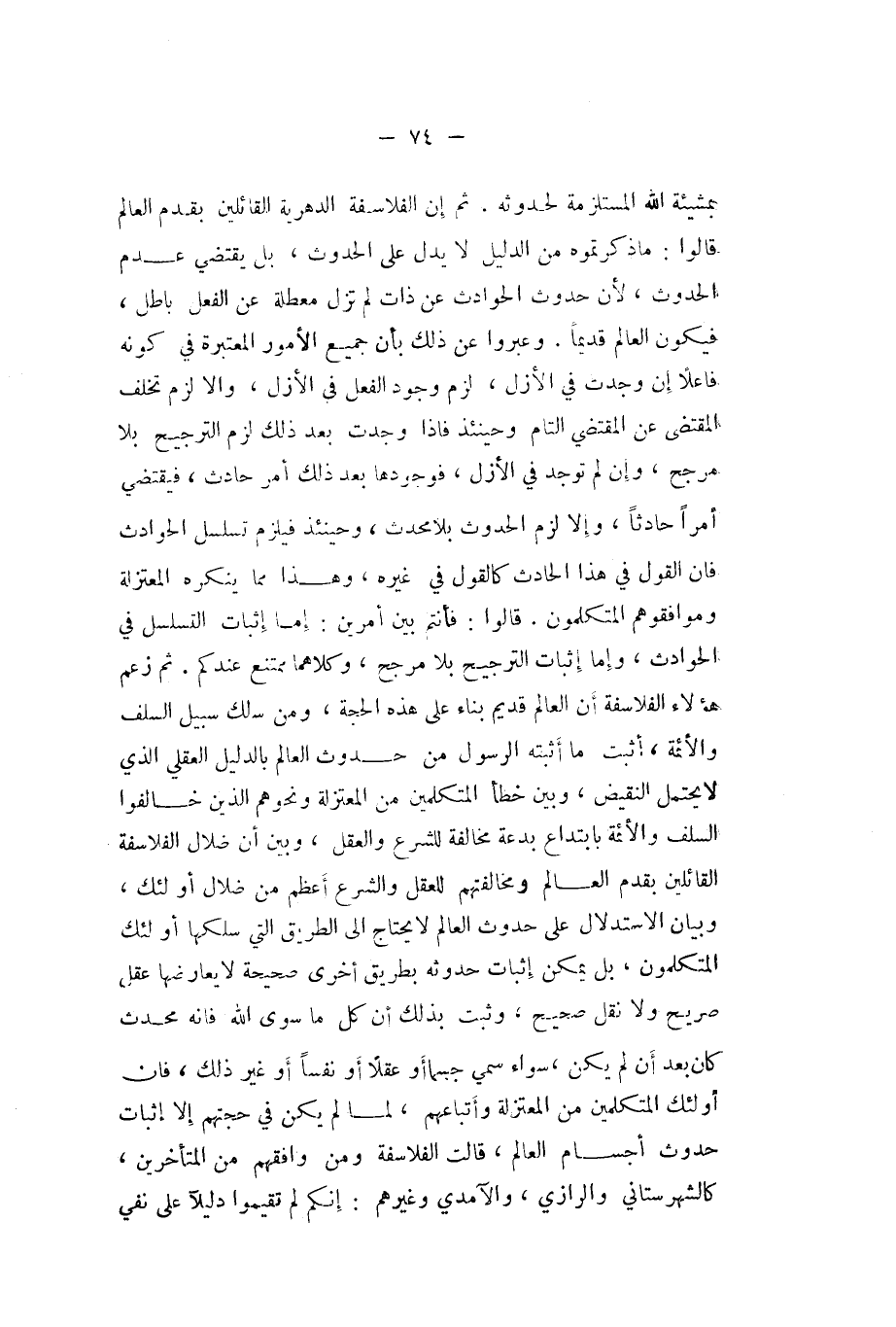 بِمَشِيئَة الله المستلزمة لحدوثه ثمَّ إِن الفلاسفة الدهرية الْقَائِلين بقدم الْعَالم قَالُوا مَا ذكرتموه من الدَّلِيل لَا يدل على الْحُدُوث بل يَقْتَضِي عدم الْحُدُوث لِأَن حُدُوث الْحَوَادِث عَن ذَات لم تزل معطلة عَن الْفِعْل بَاطِل فَيكون الْعَالم قَدِيما وعبروا عَن ذَلِك بِأَن جَمِيع الْأُمُور الْمُعْتَبرَة فِي كَونه فَاعِلا إِن وجدت فِي الْأَزَل لزم وجود الْفِعْل فِي الْأَزَل وَإِلَّا لزم تخلف الْمُقْتَضِي التَّام وَحِينَئِذٍ فَإِذا وجدت بعد ذَلِك لزم التَّرْجِيح بِلَا مُرَجّح وَإِن لم تُوجد فِي الْأَزَل فوجودها بعد ذَلِك أَمر حَادث فَيَقْتَضِي أمرا حَادِثا وَإِلَّا لزم الْحُدُوث بِلَا مُحدث وَحِينَئِذٍ فَيلْزم تسلسل الْحَوَادِث فَإِن القَوْل فِي هَذَا الْحَادِث كالقول فِي غَيره وَهَذَا مِمَّا يُنكره الْمُعْتَزلَة وموافقوهم المتكلمون قَالُوا فَأنْتم بَين أَمريْن إِمَّا إِثْبَات التسلسل فِي الْحَوَادِث وَإِمَّا إِثْبَات التَّرْجِيح بِلَا مُرَجّح وَكِلَاهُمَا مُمْتَنع عنْدكُمْ ثمَّ زعم هَؤُلَاءِ الفلاسفة أَن الْعَالم الْقَدِيم بِنَاء على هَذِه الْحجَّة وَمن سلك سَبِيل السّلف وَالْأَئِمَّة أثبت مَا أثْبته الرَّسُول من حُدُوث الْعَالم بِالدَّلِيلِ الْعقلِيّ الَّذِي لَا يحْتَمل النقيض وَبَين خطأ الْمُتَكَلِّمين من الْمُعْتَزلَة وَنَحْوهم الَّذين خالفوا السّلف وَالْأَئِمَّة بابتداع بِدعَة مُخَالفَة للشَّرْع وَالْعقل وَبَين أَن ضلال الفلاسفة الْقَائِلين بقدم الْعَالم ومخالفتهم لِلْعَقْلِ وَالشَّرْع أعظم من ضلال أُولَئِكَ وَبَيَان الِاسْتِدْلَال على حُدُوث الْعَالم لَا يحْتَاج إِلَى الطَّرِيق الَّتِي سلكها أُولَئِكَ المتكلمون بل يُمكن إِثْبَات حُدُوثه بطرِيق أُخْرَى صَحِيحَة لَا يعارضها عقل صَرِيح وَلَا نقل صَحِيح وَثَبت بذلك أَن كل مَا سوى الله فَإِنَّهُ مُحدث كَانَ بعد أَن لم يكن سَوَاء سمي جسما أَو عقلا أَو نفسا أَو غير ذَلِك فَإِن أُولَئِكَ الْمُتَكَلِّمين من الْمُعْتَزلَة وأتباعهم لما لم يكن فِي حجتهم إِلَّا إِثْبَات حُدُوث أجسام الْعَالم قَالَت الفلاسفة وَمن وفقهم من الْمُتَأَخِّرين كالشهرستاني والرازي والآمدي وَغَيرهم أَنكُمْ لم تُقِيمُوا دَلِيلا على نفي