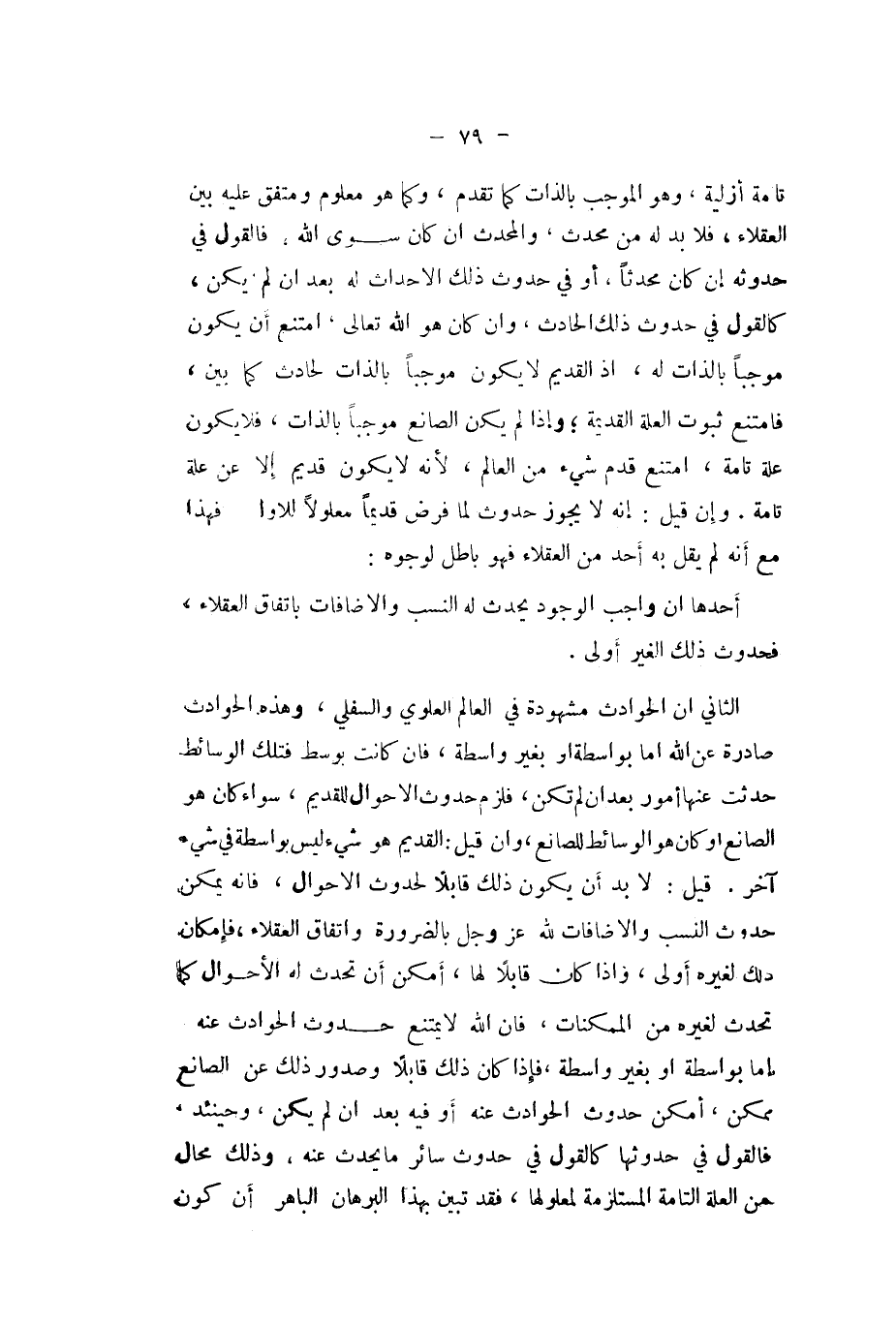 تَامَّة أزلية وَهُوَ الْمُوجب بِالذَّاتِ كَمَا تقدم وكما هُوَ مَعْلُوم ومتفق عَلَيْهِ بَين الْعُقَلَاء فَلَا بُد لَهُ من مُحدث والمحدث ان كَانَ سوى الله فَالْقَوْل فِي حُدُوثه إِن كَانَ مُحدثا أَو فِي حُدُوث ذَلِك الْأَحْدَاث لَهُ بعد ان لم يكن كالقول فِي حُدُوث ذَلِك الْحَادِث وان كَانَ هُوَ الله تَعَالَى امْتنع أَن يكون مُوجبا بِالذَّاتِ لَهُ اذ الْقَدِيم لَا يكون مُوجبا بِالذَّاتِ لحادث كَمَا بَين فَامْتنعَ ثُبُوت الْعلَّة الْقَدِيمَة وَإِذا لم يكن الصَّانِع مُوجبا بِالذَّاتِ فَلَا يكون عِلّة تَامَّة امْتنع قدم شَيْء من الْعَالم لِأَنَّهُ لَا يكون قديم إِلَّا عَن عِلّة تَامَّة وَإِن قيل إِنَّه لَا يجوز حُدُوث لما فرض قَدِيما معلولا للاول فَهَذَا مَعَ أَنه لم يقل بِهِ أحدا من الْعُقَلَاء فَهُوَ بَاطِل لوجوه