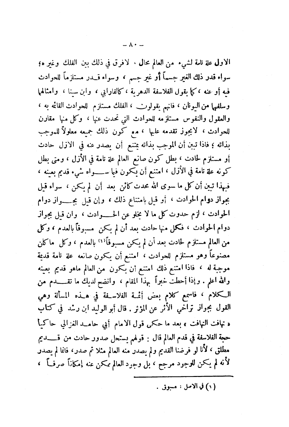 الاول عِلّة تَامَّة لشَيْء من الْعَالم محَال لَا فرق فِي ذَلِك بَين الْفلك وَغَيره سَوَاء قدر ذَلِك الْغَيْر جسما اَوْ غير جسم وَسَوَاء قدر مستلزما للحوادث فِيهِ أَو عَنهُ كَمَا يَقُول الفلاسفة الدهرية كالفارابي وَابْن سينا وامثالهما وسلفهما من اليونان فَإِنَّهُم يَقُولُونَ الْفلك مُسْتَلْزم للحوادث الْقَائِمَة بِهِ والعقول والنفوس مستلزمة للحوادث الَّتِي تحدث عَنْهَا وكل مِنْهَا مُقَارن للحوادث لَا يجوز تقدمه عَلَيْهَا مَعَ كَون ذَلِك جَمِيعه معلولا للموجب بِذَاتِهِ فاذا تبين أَن الْمُوجب بِذَاتِهِ يمْتَنع أَن يصدر عَنهُ فِي الازل حَادث اَوْ مُسْتَلْزم لحادث بَطل كَون صانع الْعَالم عِلّة تَامَّة فِي الازل وَمَتى بَطل كَونه عِلّة تَامَّة فِي الازل امْتنع أَن يكون فِيمَا سواهُ شَيْء قديم بِعَيْنِه فَبِهَذَا تبين أَن كل مَا سوى الله مُحدث كَائِن بعد أَن لم يكن سَوَاء قيل بِجَوَاز دوَام الْحَوَادِث أَو قيل بامتناع ذَلِك وَإِن قيل بِجَوَاز دوَام الْحَوَادِث لزم حُدُوث كل مَا لَا يَخْلُو عَن الْحَوَادِث وَإِن قيل بِجَوَاز دوَام الْحَوَادِث فَكل مِنْهَا حَادث بعد أَن لم يكن مَسْبُوقا بِالْعدمِ وكل من الْعَالم مُسْتَلْزم لحادث بعد أَن لم يكن مَسْبُوقا بِالْعدمِ وكل مَا كَانَ مصنوعا وَهُوَ مُسْتَلْزم للحوادث امْتنع أَن يكون صانعه عِلّة تَامَّة قديمَة مُوجبَة لَهُ فاذا امْتنع ذَلِك امْتنع ان يكون من الْعَالم مَا هُوَ قديم بِعَيْنِه وَالله اعْلَم وَإِذا أحطت خَبرا بِهَذَا الْمقَام واتضح لديك مَا تقدم من الْكَلَام فاسمع كَلَام بعض أَئِمَّة الفلاسفة فِي هَذِه الْمَسْأَلَة وَهِي القَوْل بِجَوَاز تراخي الاثر عَن الْمُؤثر قَالَ أَبُو الْوَلِيد ابْن رشد فِي كتاب (تهافت التهافت (بعد مَا حكى قَول الامام أبي حَامِد الْغَزالِيّ حاكيا حجَّة الفلاسفة فِي قدم الْعَالم قَالَ قَوْلهم يسْتَحل صُدُور حَادث من قديم مُطلق لأَنا لَو فَرضنَا الْقَدِيم وَلم يصدر مِنْهُ الْعَالم مثلا ثمَّ صدر فانما لم يصدر لِأَنَّهُ لم يكن للوجود مُرَجّح بل وجود الْعَالم مُمكن عَنهُ امكانا صرفا