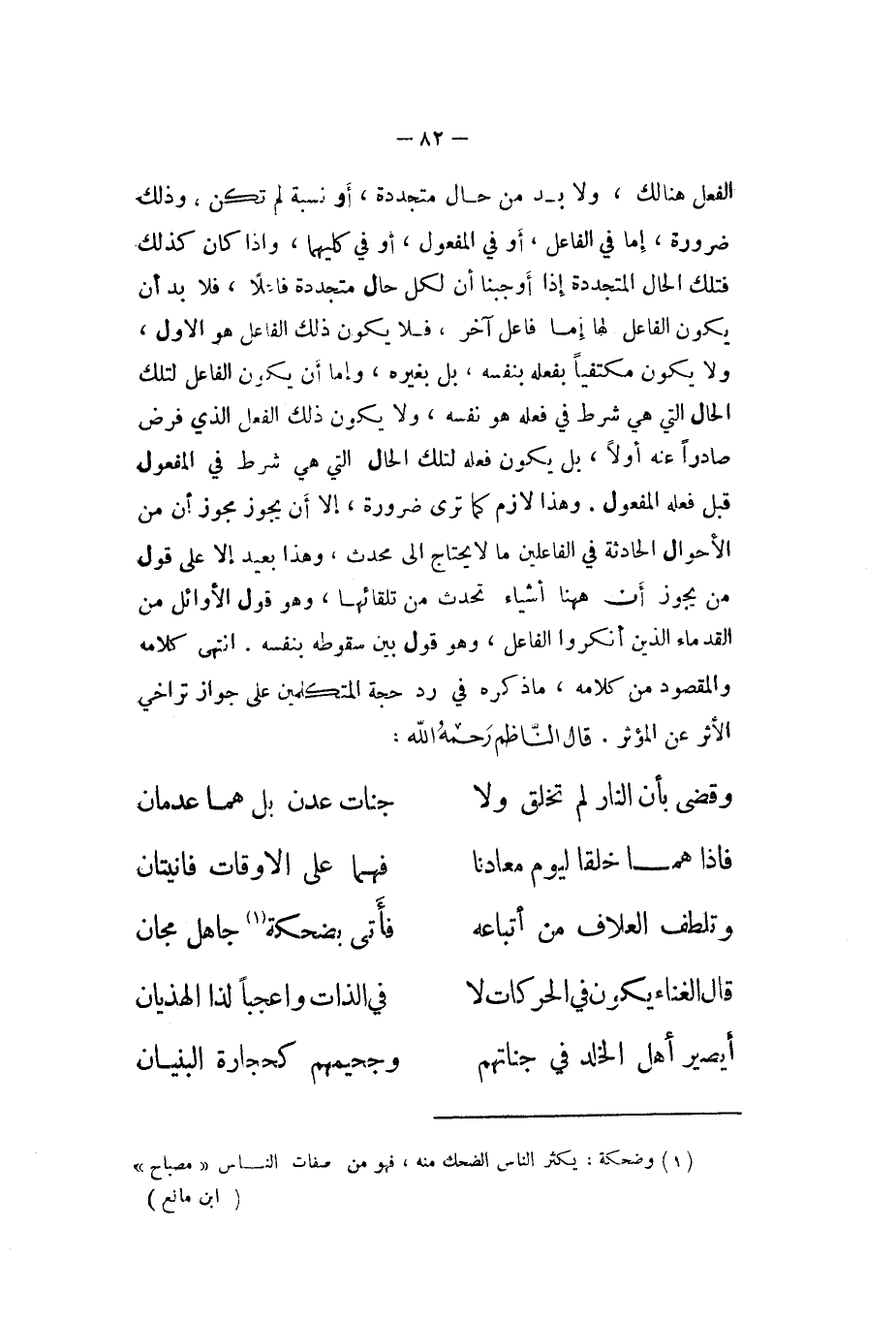 الْفِعْل هُنَالك وَلَا بُد من حَال متجددة أَو نِسْبَة لم تكن وَذَلِكَ ضَرُورَة إِمَّا فِي الْفَاعِل أَو فِي الْمَفْعُول أَو فِي كليهمَا واذا كَانَ كَذَلِك فَتلك الْحَال المتجددة إِذا أَوجَبْنَا أَن لكل حَال متجددة فَاعِلا فَلَا بُد أَن يكون الْفَاعِل لَهَا إِمَّا فَاعل آخر فَلَا يكون ذَلِك الْفَاعِل هُوَ الاول وَلَا يكون مكتفيا بِفِعْلِهِ بِنَفسِهِ بل بِغَيْرِهِ وَإِمَّا أَن يكون الْفَاعِل لتِلْك الْحَال الَّتِي هِيَ شَرط فِي فعله هُوَ نَفسه وَلَا يكون ذَلِك الْفِعْل الَّذِي فرض صادرا عَنهُ أَولا بل يكون فعله لتِلْك الْحَال الَّتِي هِيَ شَرط فِي الْمَفْعُول قبل فعله الْمَفْعُول وَهَذَا لَازم كَمَا ترى ضَرُورَة الا أَن يجوز مجوز أَن من الاحوال الْحَادِثَة فِي الفاعلين مَا لَا يحْتَاج الى مُحدث وَهَذَا بعيد إِلَّا على قَول من يجوز أَن هَهُنَا أَشْيَاء تحدث من تلقائها وَهُوَ قَول الاوائل من القدماء الَّذين أَنْكَرُوا الْفَاعِل وَهُوَ قَول بَين سُقُوطه بِنَفسِهِ انْتهى كَلَامه وَالْمَقْصُود من كَلَامه مَا ذكره فِي رد حجَّة الْمُتَكَلِّمين على جَوَاز تراخي الاثر عَن الْمُؤثر قَالَ النَّاظِم رَحمَه الله