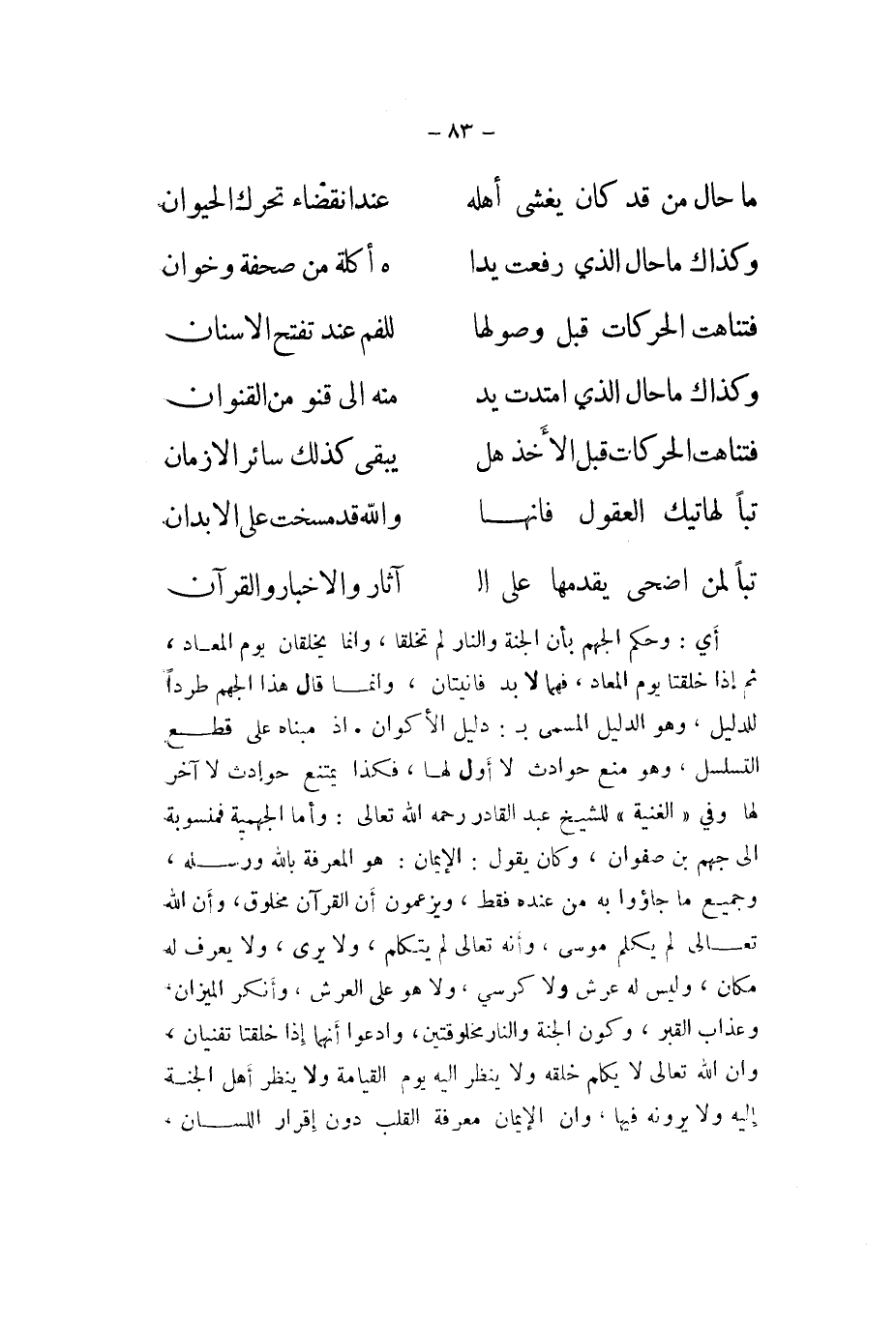 أَي وَحكم الجهم بِأَن الْجنَّة وَالنَّار لم تخلقا وانما يخلقان يَوْم الْمعَاد ثمَّ إِذا خلقتا يَوْم الْمعَاد فهما لابد فانيتان وانما قَالَ هَذَا الجهم طردا للدليل وَهُوَ الدَّلِيل الْمُسَمّى ب دَلِيل الاكوان اذ مبناه على قطع التسلسل وَهُوَ منع حوادث لَا أول لَهَا فَكَذَا يمْتَنع حوادث لَا آخر لَهَا وَفِي (الغنية (للشَّيْخ عبد الْقَادِر رَحمَه الله تَعَالَى وَأما الْجَهْمِية فمنسوبة الى جهم بن صَفْوَان وَكَانَ يَقُول الايمان هُوَ الْمعرفَة بِاللَّه وَرُسُله وَجَمِيع مَا جاؤوا بِهِ من عِنْده فَقَط ويزعمون أَن الْقُرْآن مَخْلُوق وَأَن الله تَعَالَى لم يكلم مُوسَى وَأَنه تَعَالَى لم يتَكَلَّم وَلَا يرى وَلَا يعرف لَهُ مَكَان وَلَيْسَ لَهُ عرش وَلَا كرْسِي وَلَا هُوَ على الْعَرْش وَأنكر الْمِيزَان وَعَذَاب الْقَبْر وَكَون الْجنَّة وَالنَّار مخلوقتين وَادعوا أَنَّهُمَا إِذا خلقتا تقنيان وان الله تَعَالَى لَا يكلم خلقه وَلَا ينظر اليه يَوْم الْقِيَامَة وَلَا ينظر أهل الْجنَّة اليه وَلَا يرونه فِيهَا وان الايمان معرفَة الْقلب دون إِقْرَار اللِّسَان