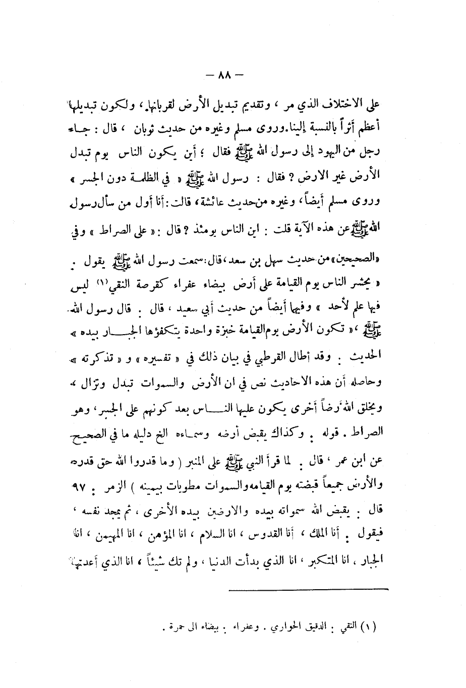 على الإختلاف الَّذِي مر وَتَقْدِيم تَبْدِيل الارض لقربانها وَلكَون تبديلها أعظم أثرا بِالنِّسْبَةِ إِلَيْنَا وروى مُسلم وَغَيره من حَدِيث ثَوْبَان قَالَ جَاءَ رجل من الْيَهُود الى رَسُول الله صلى الله عَلَيْهِ وَسلم فَقَالَ أَيْن يكون النَّاس يَوْم تبدل الارض غير الارض فَقَالَ رَسُول الله صلى الله عَلَيْهِ وَسلم (فِي الظلمَة دون الجسر (وروى مُسلم أَيْضا وَغَيره من حَدِيث عَائِشَة قَالَت أَنا أول من سَأَلَ رَسُول الله صلى الله عَلَيْهِ وَسلم عَن هَذِه الْآيَة قلت ايْنَ النَّاس يَوْمئِذٍ قَالَ (على الصِّرَاط (وَفِي (الصَّحِيحَيْنِ (من حَدِيث سهل بن سعد قَالَ سَمِعت رَسُول الله صلى الله عَلَيْهِ وَسلم يَقُول (يحْشر النَّاس يَوْم الْقِيَامَة على أَرض بَيْضَاء عفراء كقرصة النقي لَيْسَ فِيهَا علم لَاحَدَّ (وَفِيهِمَا أَيْضا من حَدِيث أبي سعيد قَالَ قَالَ رَسُول الله صلى الله عَلَيْهِ وَسلم (تكون الارض يَوْم الْقِيَامَة خبْزَة وَاحِدَة يَتَكَفَّؤُهَا الْجَبَّار بِيَدِهِ (الحَدِيث وَقد أَطَالَ الْقُرْطُبِيّ فِي بَيَان ذَلِك فِي (تَفْسِيره (وتذكرته (وَحَاصِله أَن هَذِه الاحاديث نَص فِي ان الارض وَالسَّمَوَات تبدل وتزال ويخلق الله ارضا اخرى يكون عَلَيْهَا النَّاس بعد كَونهم على الجسر وَهُوَ الصِّرَاط قَوْله وكذاك يقبض أرضه وسماءه الخ دليلة مَا فِي الصَّحِيح عَن ابْن عمر قَالَ لما قَرَأَ النَّبِي صلى الله عَلَيْهِ وَسلم على الْمِنْبَر {وَمَا قدرُوا الله حق قدره وَالْأَرْض جَمِيعًا قَبضته يَوْم الْقِيَامَة وَالسَّمَاوَات مَطْوِيَّات بِيَمِينِهِ} الزمر 97 قَالَ يقبض الله سمواته بِيَدِهِ والارضين بِيَدِهِ الاخرى ثمَّ يمجد نَفسه قيقول أَنا الْملك أَنا القدوس أَنا السَّلَام أَنا الْمُؤمن أَنا الْمُهَيْمِن أَنا الْجَبَّار أَنا المتكبر أَنا الَّذِي بدأت الدُّنْيَا وَلم تَكُ شَيْئا انا الَّذِي أعدتها