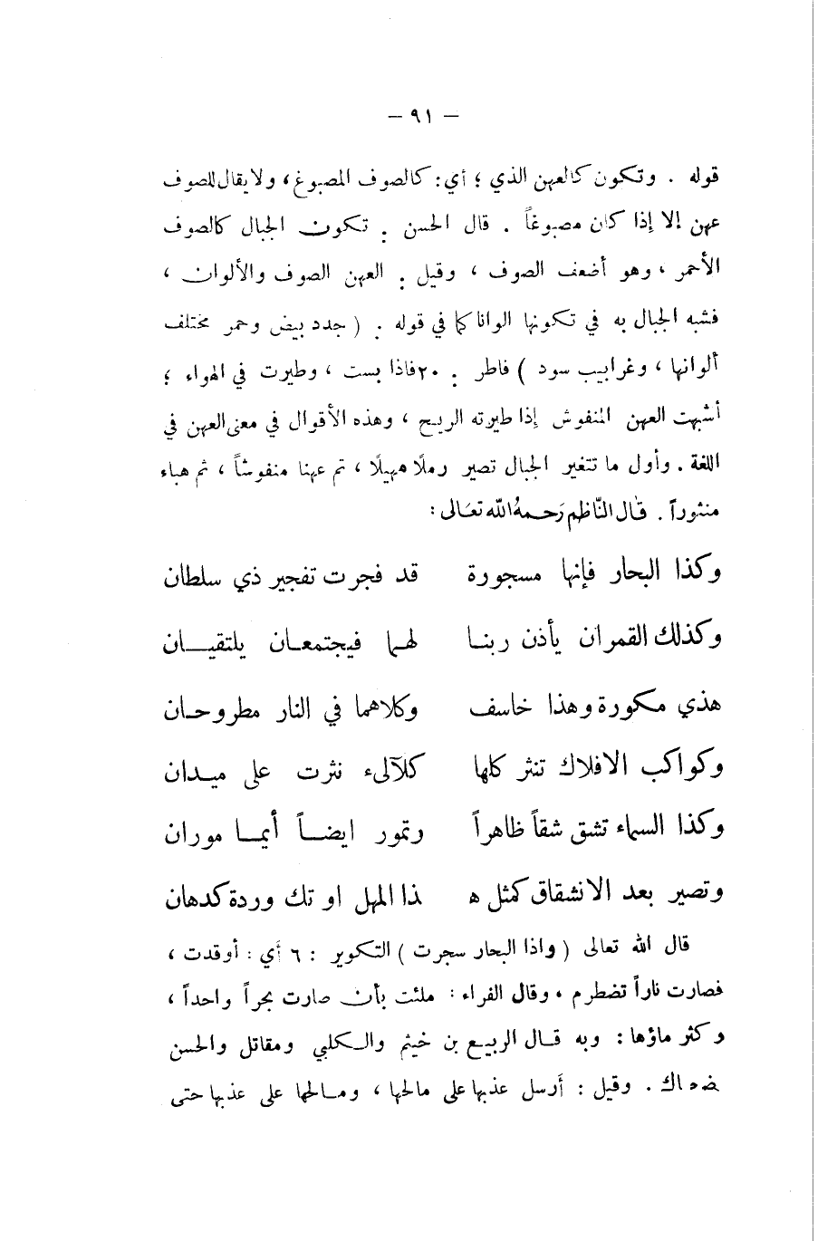 قَالَ الله تَعَالَى {وَإِذا الْبحار سجرت} التكوير 6 أَي اوقدت فَصَارَت نَارا تضطرم وَقَالَ الْفراء ملئت بِأَن صَارَت بحرا وَاحِدًا وَكثر مَاؤُهَا وَبِه قَالَ الرّبيع بن خَيْثَم والكلبي وَمُقَاتِل وَالْحسن الضَّحَّاك وَقيل أرسل عذبها على مالحها ومالحها على عذبها حَتَّى