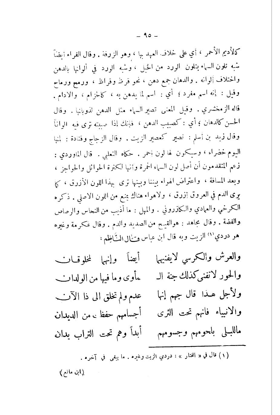 كالاديم الاحمر أَي على خلاف الْعَهْد بهَا وَهُوَ الزرقة وَقَالَ الْفراء أَيْضا شبه تلون السَّمَاء بتلون الْورْد من الْخَيل وَشبه الْورْد فِي ألوانها بالدهن وَاخْتِلَاف ألوانه والدهان جمع دهن نَحْو قرظ وقراظ ورمح ورماح وَقيل إِنَّه اسْم مُفْرد أَي اسْم لما يدهن بِهِ كالحزام والادام قَالَه الزَّمَخْشَرِيّ وَقيل الْمَعْنى تصير السَّمَاء مثل الدّهن لذوبانها وَقَالَ الْحسن كالدهان أَي كصبيب الدّهن فَإنَّك إِذا صببته ترى فِيهِ الوانا وَقَالَ زيد بن أسلم تصير كعصير الزَّيْت وَقَالَ الزّجاج وَقَتَادَة إِنَّهَا الْيَوْم خضراء وسيكون لَهَا لون أَحْمَر حَكَاهُ الثَّعْلَبِيّ قَالَ الْمَاوَرْدِيّ زعم المتقدمون أَن أصل لون السَّمَاء الْحمرَة وَأَنَّهَا لِكَثْرَة الحوائل والحواجز وَبعد الْمسَافَة وَاعْتِرَاض الْهَوَاء بَيْننَا وَبَينهَا ترى بِهَذَا اللَّوْن الازرق كَمَا يرى الدَّم فِي الْعُرُوق أَزْرَق وَلَا هَوَاء هُنَاكَ يمْنَع من اللَّوْن الاصلي ذكره الْكَرْخِي والعمادي والكازروني والمهل مَا أذيب من النّحاس والرصاص وَالْفِضَّة وَقَالَ مُجَاهِد هُوَ الْقَيْح من الصديد وَالدَّم وَقَالَ عِكْرِمَة وَغَيره هُوَ دردي الزَّيْت وَبِه قَالَ ابْن عَبَّاس قَالَ النَّاظِم