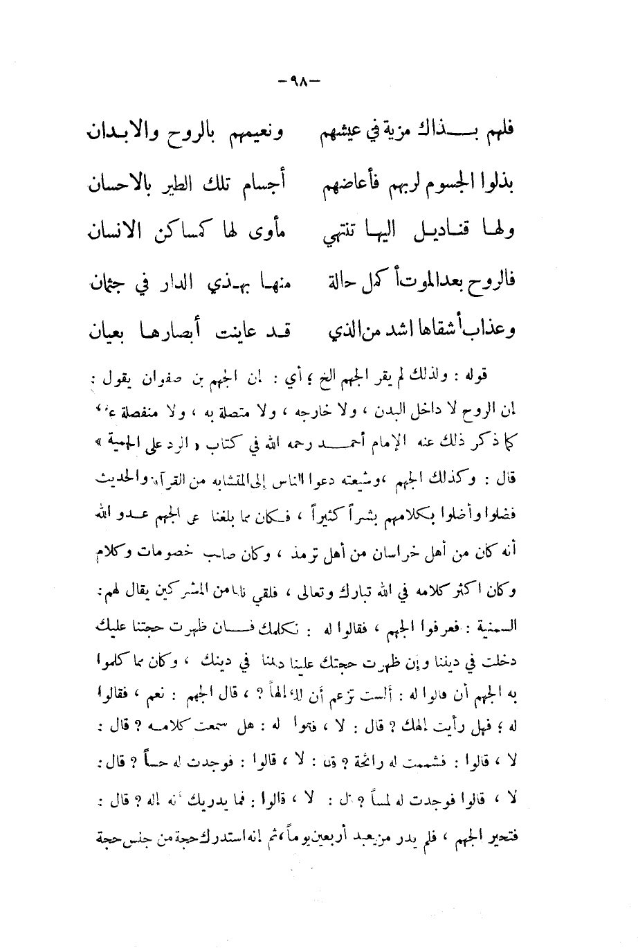 قَوْله وَلذَلِك لم يقر الجهم الخ أَي إِن الجهم بن صَفْوَان يَقُول إِن الرّوح لَا دَاخل الْبدن وَلَا خَارِجَة وَلَا مُتَّصِلَة بِهِ وَلَا مُنْفَصِلَة عَنهُ كَمَا ذكر ذَلِك عَنهُ الامام احْمَد رَحمَه الله فِي كتاب (الرَّد على الْجَهْمِية (قَالَ وَكَذَلِكَ الجهم وشيعته دعوا للنَّاس الى الْمُتَشَابه من الْقُرْآن والْحَدِيث فضلوا وأضلوا بكلامهم بشرا كثيرا فَكَانَ مِمَّا بلغنَا عَن الجهم عَدو الله أَنه كَانَ من أهل خُرَاسَان من أهل ترمذ وَكَانَ صَاحب خصومات وَكَلَام وَكَانَ اكثر كَلَامه فِي الله تبَارك وَتَعَالَى فلقي نَاسا من الْمُشْركين يُقَال لَهُم السمنية فعرفوا الجهم فَقَالُوا لَهُ نكلمك فان ظَهرت حجتنا عَلَيْك دخلت فِي ديننَا وَإِن ظَهرت حجتك علينا دَخَلنَا فِي دينك وَكَانَ مِمَّا كلموا بِهِ الجهم أَن قَالُوا لَهُ أَلَسْت تزْعم أَن لَك إِلَهًا قَالَ الجهم نعم فَقَالُوا لَهُ فَهَل رَأَيْت إلهك قَالَ لَا فَقَالُوا لَهُ هَل سَمِعت كَلَامه قَالَ لَا قَالُوا فشممت لَهُ رَائِحَة قَالَ لَا قَالُوا فَوجدت لَهُ حسا قَالَ لَا قَالُوا فَوجدت لَهُ لمسا قَالَ لَا قَالُوا فَمَا يدْريك انه إِلَه قَالَ فتحير الجهم فَلم يدر من يعبد أَرْبَعِينَ يَوْمًا ثمَّ أَنه استدرك حجَّة من جنس حجَّة