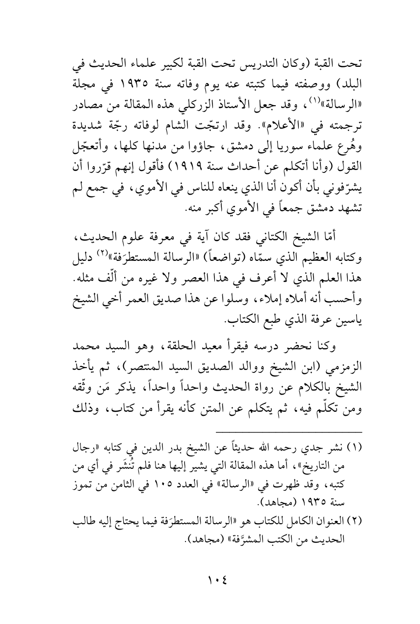 (¬1) نشر جدي رحمه الله حديثاً عن الشيخ بدر الدين في كتابه «رجال من التاريخ»، أما هذه المقالة التي يشير إليها هنا فلم تُنشَر في أي من كتبه، وقد ظهرت في «الرسالة» في العدد 105 في الثامن من تموز سنة 1935 (مجاهد).