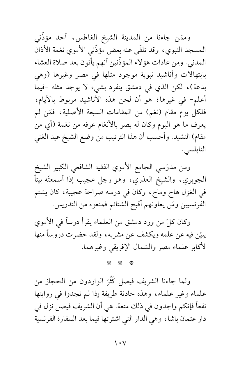 ولما جاءنا الشريف فيصل كَثُرَ الواردون من الحجاز من علماء وغير علماء، وهذه حادثة طريفة إذا لم تجدوا في روايتها نفعاً فإنكم واجدون في ذلك متعة. هي أن الشريف فيصل نزل في دار عثمان باشا، وهي الدار التي اشترتها فيما بعد السفارة الفرنسية
