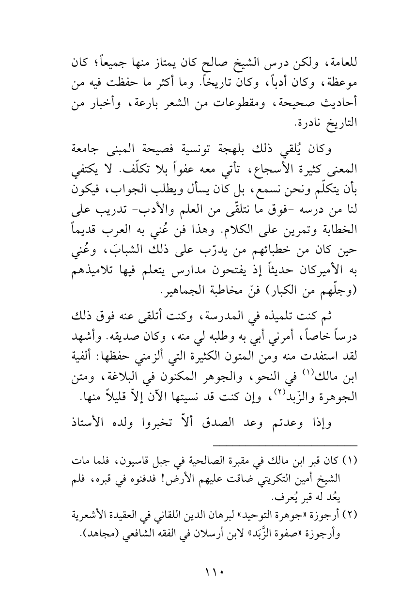للعامة، ولكن درس الشيخ صالح كان يمتاز منها جميعاً؛ كان موعظة، وكان أدباً، وكان تاريخاً. وما أكثر ما حفظت فيه من أحاديث صحيحة، ومقطوعات من الشعر بارعة، وأخبار من التاريخ نادرة.