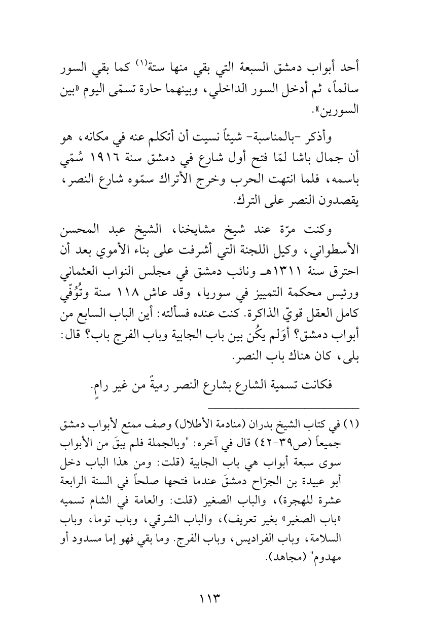 وكنت مرّة عند شيخ مشايخنا، الشيخ عبد المحسن الأسطواني، وكيل اللجنة التي أشرفت على بناء الأموي بعد أن احترق سنة 1311هـ ونائب دمشق في مجلس النواب العثماني ورئيس محكمة التمييز في سوريا، وقد عاش 118 سنة وتُوُفّي كامل العقل قويّ الذاكرة. كنت عنده فسألته: أين الباب السابع من أبواب دمشق؟ أوَلم يكُن بين باب الجابية وباب الفرج باب؟ قال: بلى، كان هناك باب النصر.