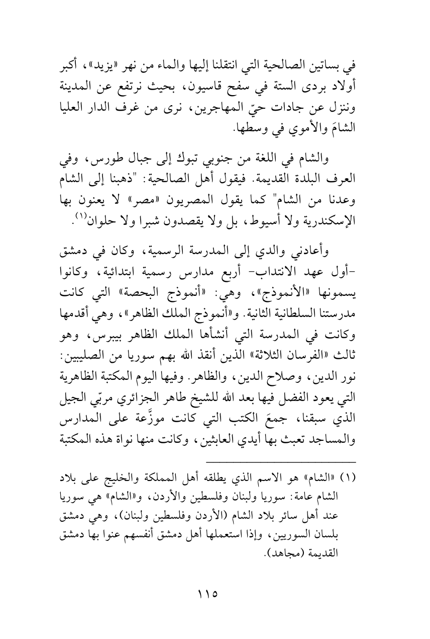 (¬1) «الشام» هو الاسم الذي يطلقه أهل المملكة والخليج على بلاد الشام عامة: سوريا ولبنان وفلسطين والأردن، و «الشام» هي سوريا عند أهل سائر بلاد الشام (الأردن وفلسطين ولبنان)، وهي دمشق بلسان السوريين، وإذا استعملها أهل دمشق أنفسهم عنوا بها دمشق القديمة (مجاهد).