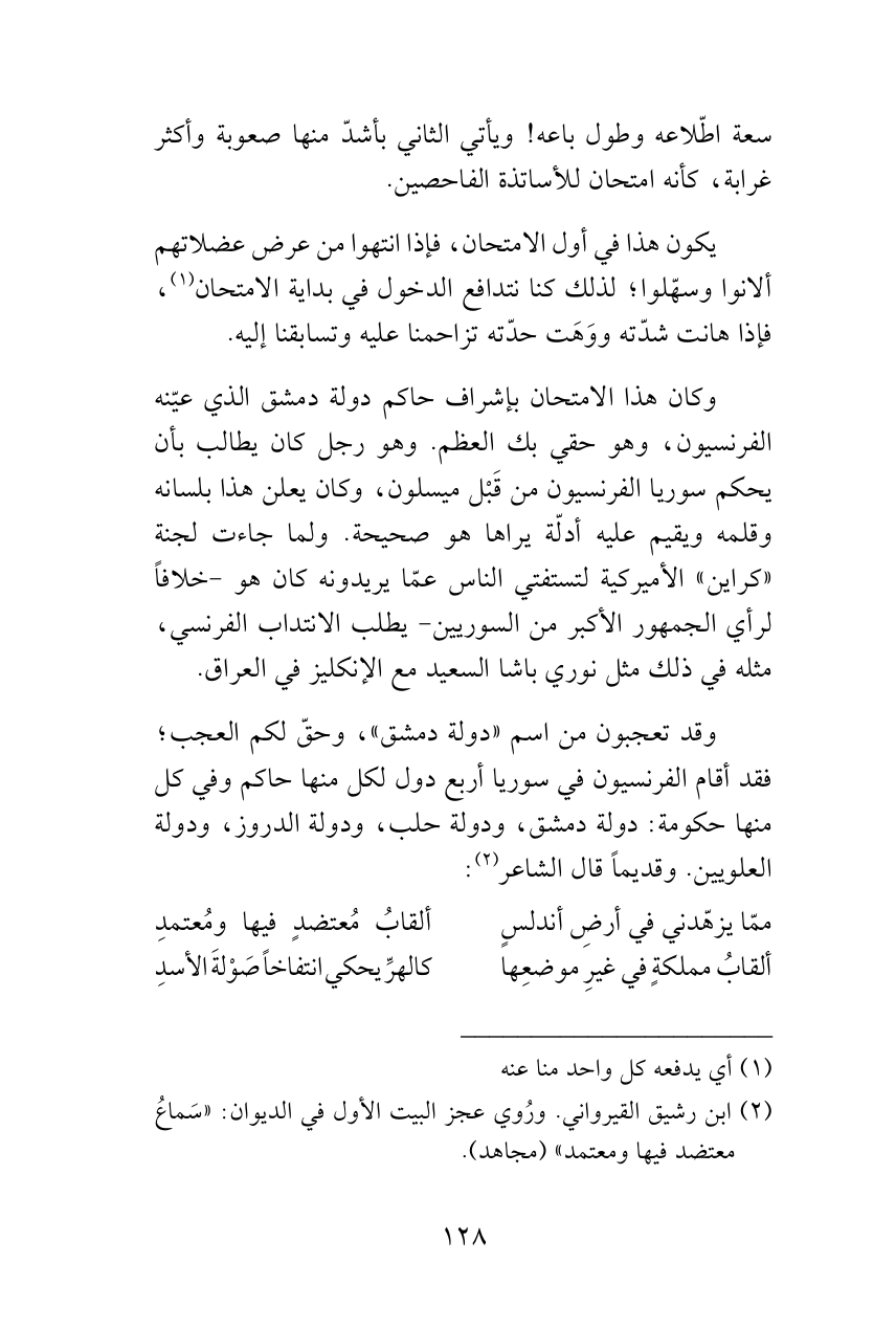 وقد تعجبون من اسم «دولة دمشق»، وحقّ لكم العجب؛ فقد أقام الفرنسيون في سوريا أربع دول لكل منها حاكم وفي كل منها حكومة: دولة دمشق، ودولة حلب، ودولة الدروز، ودولة العلويين. وقديماً قال الشاعر (¬2):