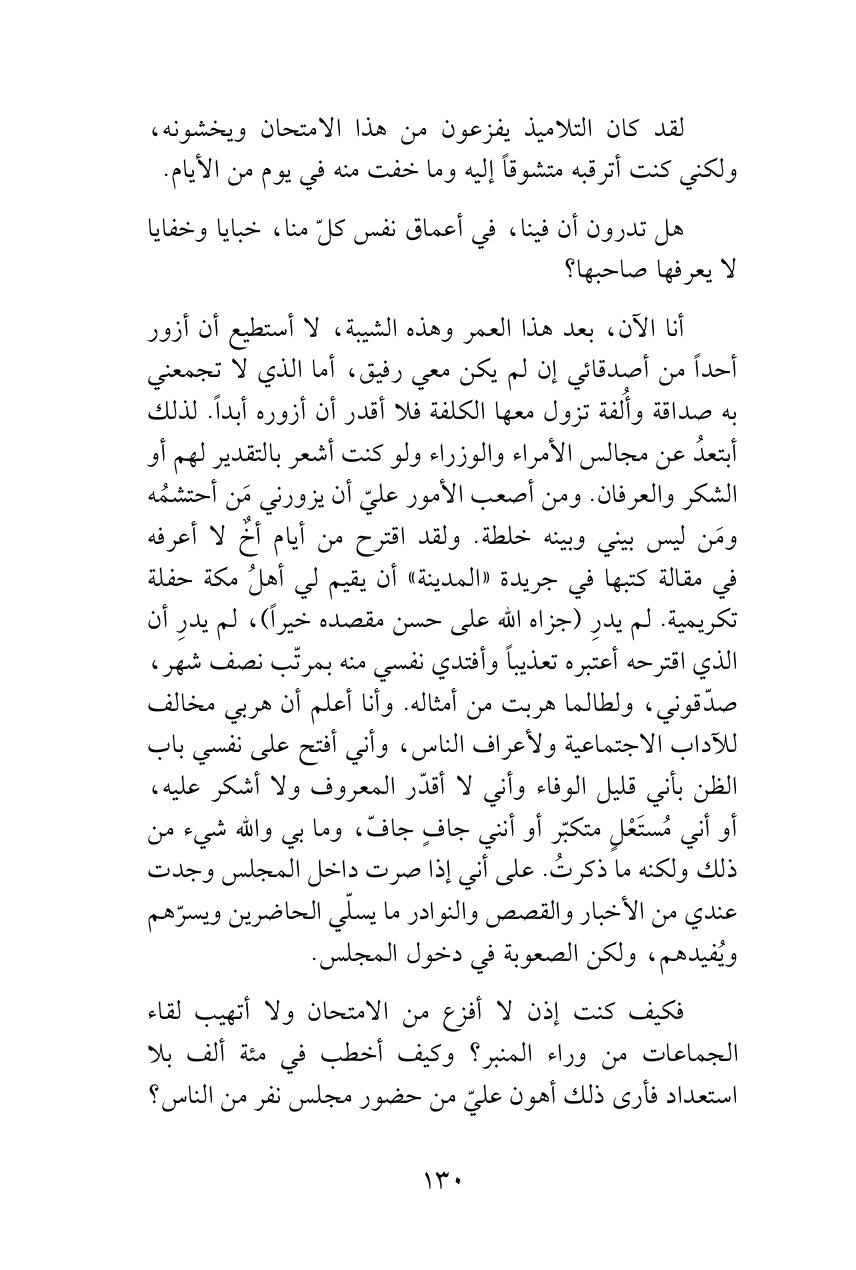 أنا الآن، بعد هذا العمر وهذه الشيبة، لا أستطيع أن أزور أحداً من أصدقائي إن لم يكن معي رفيق، أما الذي لا تجمعني به صداقة وأُلفة تزول معها الكلفة فلا أقدر أن أزوره أبداً. لذلك أبتعدُ عن مجالس الأمراء والوزراء ولو كنت أشعر بالتقدير لهم أو الشكر والعرفان. ومن أصعب الأمور عليّ أن يزورني مَن أحتشمُه ومَن ليس بيني وبينه خلطة. ولقد اقترح من أيام أخٌ لا أعرفه في مقالة كتبها في جريدة «المدينة» أن يقيم لي أهلُ مكة حفلة تكريمية. لم يدرِ (جزاه الله على حسن مقصده خيراً)، لم يدرِ أن الذي اقترحه أعتبره تعذيباً وأفتدي نفسي منه بمرتّب نصف شهر، صدّقوني، ولطالما هربت من أمثاله. وأنا أعلم أن هربي مخالف للآداب الاجتماعية ولأعراف الناس، وأني أفتح على نفسي باب الظن بأني قليل الوفاء وأني لا أقدّر المعروف ولا أشكر عليه، أو أني مُستَعْلٍ متكبّر أو أنني جافٍ جافّ، وما بي والله شيء من ذلك ولكنه ما ذكرتُ. على أني إذا صرت داخل المجلس وجدت عندي من الأخبار والقصص والنوادر ما يسلّي الحاضرين ويسرّهم ويُفيدهم، ولكن الصعوبة في دخول المجلس.