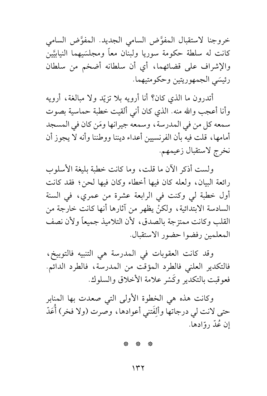 أتدرون ما الذي كان؟ أنا أرويه بلا تزيّد ولا مبالغة، أرويه وأنا أعجب والله منه. الذي كان أني ألقيت خطبة حماسية بصوت سمعه كل من في المدرسة، وسمعه جيرانها ومَن كان في المسجد أمامها، قلت فيه بأن الفرنسيين أعداء ديننا ووطننا وأنه لا يجوز أن نخرج لاستقبال زعيمهم.