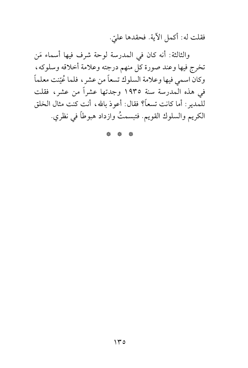 والثالثة: أنه كان في المدرسة لوحة شرف فيها أسماء مَن تخرج فيها وعند صورة كل منهم درجته وعلامة أخلاقه وسلوكه، وكان اسمي فيها وعلامة السلوك تسعاً من عشر، فلما عُيّنت معلماً في هذه المدرسة سنة 1935 وجدتها عشراً من عشر، فقلت للمدير: أما كانت تسعاً؟ فقال: أعوذ بالله، أنت كنت مثال الخلق الكريم والسلوك القويم. فتبسمتُ وازداد هبوطاً في نظري.