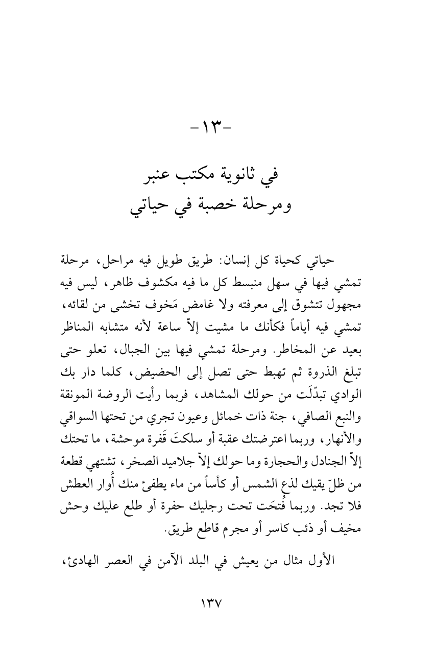 حياتي كحياة كل إنسان: طريق طويل فيه مراحل، مرحلة تمشي فيها في سهل منبسط كل ما فيه مكشوف ظاهر، ليس فيه مجهول تتشوق إلى معرفته ولا غامض مَخوف تخشى من لقائه، تمشي فيه أياماً فكأنك ما مشيت إلاّ ساعة لأنه متشابه المناظر بعيد عن المخاطر. ومرحلة تمشي فيها بين الجبال، تعلو حتى تبلغ الذروة ثم تهبط حتى تصل إلى الحضيض، كلما دار بك الوادي تبدّلَت من حولك المشاهد، فربما رأيت الروضة المونقة والنبع الصافي، جنة ذات خمائل وعيون تجري من تحتها السواقي والأنهار، وربما اعترضتك عقبة أو سلكتَ قَفرة موحشة، ما تحتك إلاّ الجنادل والحجارة وما حولك إلاّ جلاميد الصخر، تشتهي قطعة من ظلّ يقيك لذع الشمس أو كأساً من ماء يطفئ منك أُوار العطش فلا تجد. وربما فُتحَت تحت رجليك حفرة أو طلع عليك وحش مخيف أو ذئب كاسر أو مجرم قاطع طريق.