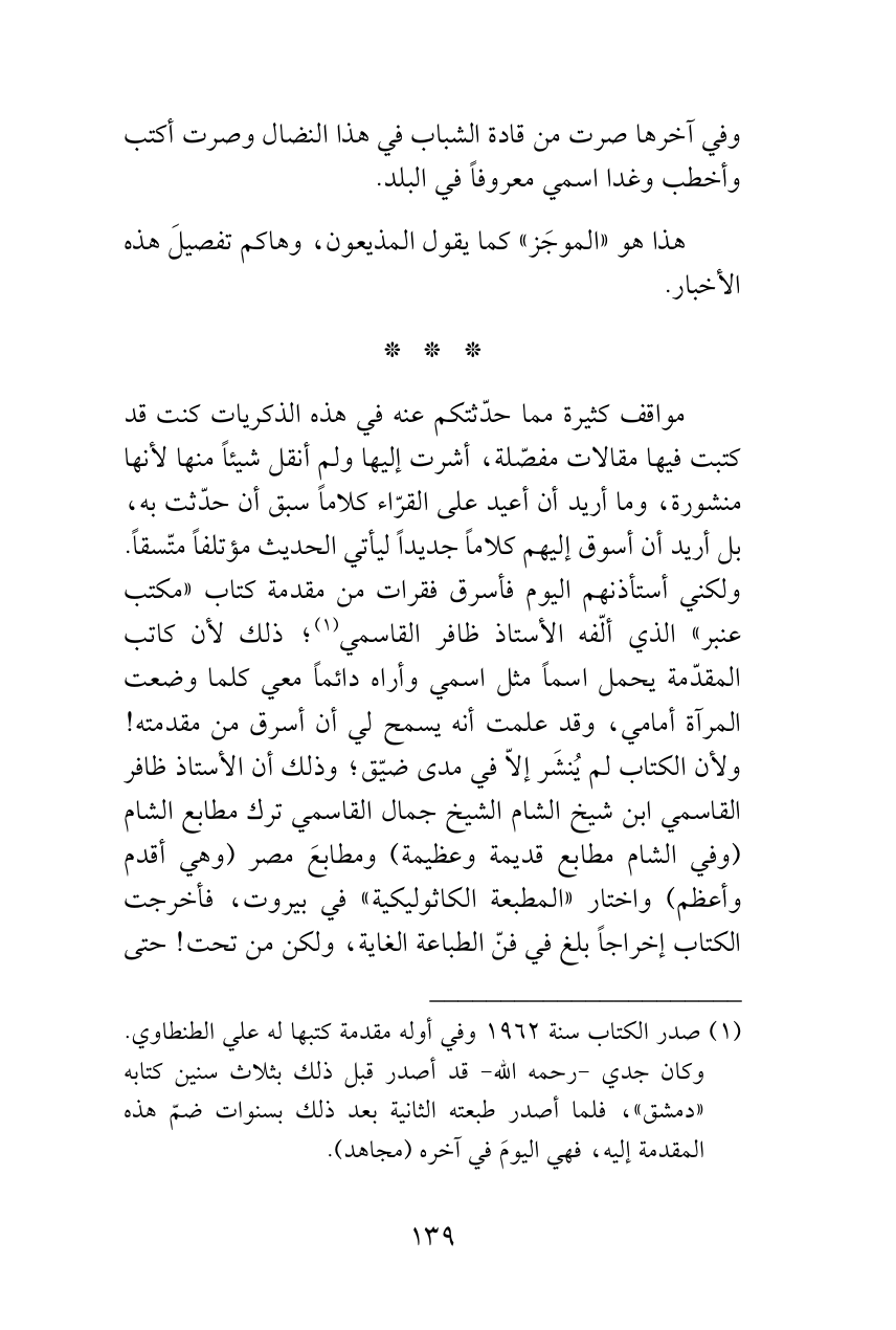 مواقف كثيرة مما حدّثتكم عنه في هذه الذكريات كنت قد كتبت فيها مقالات مفصّلة، أشرت إليها ولم أنقل شيئاً منها لأنها منشورة، وما أريد أن أعيد على القرّاء كلاماً سبق أن حدّثت به، بل أريد أن أسوق إليهم كلاماً جديداً ليأتي الحديث مؤتلفاً متّسقاً. ولكني أستأذنهم اليوم فأسرق فقرات من مقدمة كتاب «مكتب عنبر» الذي ألّفه الأستاذ ظافر القاسمي (¬1)؛ ذلك لأن كاتب المقدّمة يحمل اسماً مثل اسمي وأراه دائماً معي كلما وضعت المرآة أمامي، وقد علمت أنه يسمح لي أن أسرق من مقدمته! ولأن الكتاب لم يُنشَر إلاّ في مدى ضيّق؛ وذلك أن الأستاذ ظافر القاسمي ابن شيخ الشام الشيخ جمال القاسمي ترك مطابع الشام (وفي الشام مطابع قديمة وعظيمة) ومطابعَ مصر (وهي أقدم وأعظم) واختار «المطبعة الكاثوليكية» في بيروت، فأخرجت الكتاب إخراجاً بلغ في فنّ الطباعة الغاية، ولكن من تحت! حتى