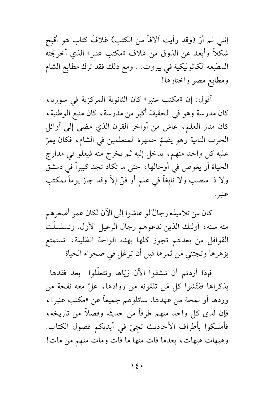 فإذا أردتم أن تنشقوا الآن رَيّاها وتتعلّلوا -بعد فقدها- بذكراها ففتّشوا كل مَن تلقونه من روادها، علّ معه نفحة من وردها أو لمحة من عهدها. سائلوهم جميعاً عن «مكتب عنبر»، فإن لدى كل واحد منهم طرفاً من حديثه وفصلاً من تاريخه، فأمسكوا بأطراف الأحاديث تجِئ في أيديكم فصول الكتاب. وهيهات هيهات، بعدما فات منها ما فات ومات منهم من مات!
