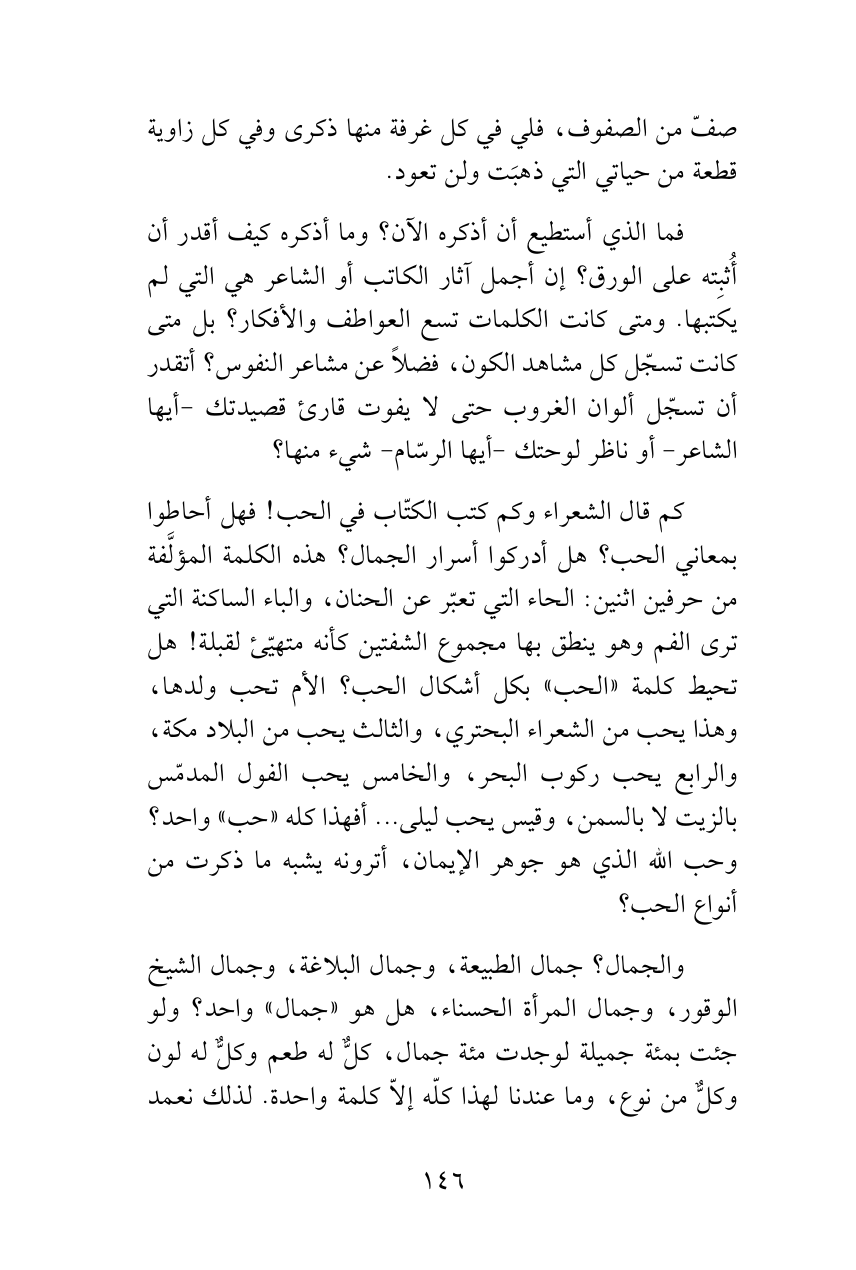 كم قال الشعراء وكم كتب الكتّاب في الحب! فهل أحاطوا بمعاني الحب؟ هل أدركوا أسرار الجمال؟ هذه الكلمة المؤلَّفة من حرفين اثنين: الحاء التي تعبّر عن الحنان، والباء الساكنة التي ترى الفم وهو ينطق بها مجموع الشفتين كأنه متهيّئ لقبلة! هل تحيط كلمة «الحب» بكل أشكال الحب؟ الأم تحب ولدها، وهذا يحب من الشعراء البحتري، والثالث يحب من البلاد مكة، والرابع يحب ركوب البحر، والخامس يحب الفول المدمّس بالزيت لا بالسمن، وقيس يحب ليلى ... أفهذا كله «حب» واحد؟ وحب الله الذي هو جوهر الإيمان، أترونه يشبه ما ذكرت من أنواع الحب؟
