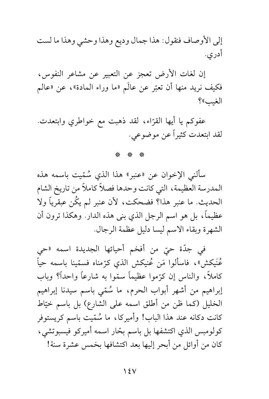 سألني الإخوان عن «عنبر» هذا الذي سُمّيت باسمه هذه المدرسة العظيمة، التي كانت وحدها فصلاً كاملاً من تاريخ الشام الحديث. ما عنبر هذا؟ فضحكت، لأن عنبر لم يكُن عبقرياً ولا عظيماً، بل هو اسم الرجل الذي بنى هذه الدار. وهكذا ترون أن الشهرة وبقاء الاسم ليسا دليل عظمة الرجال.