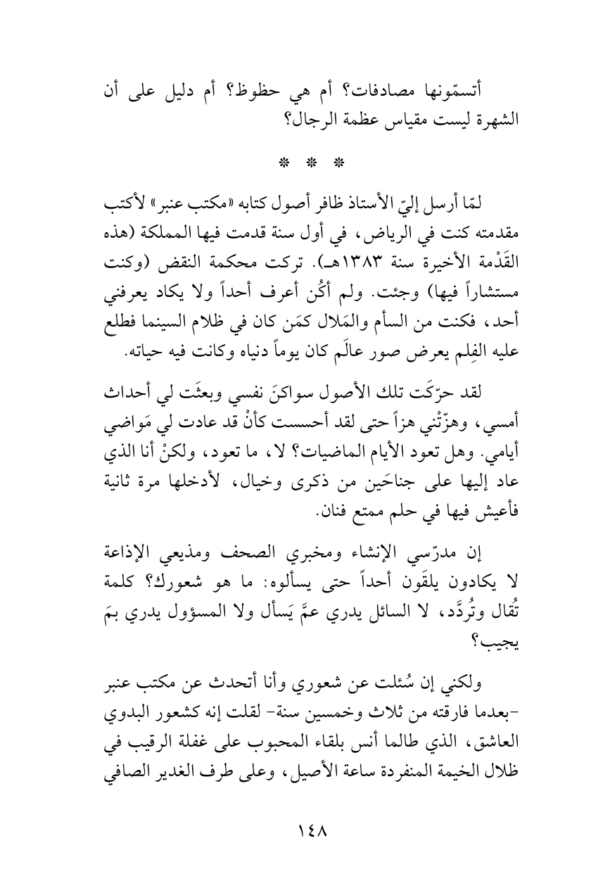 لمّا أرسل إليّ الأستاذ ظافر أصول كتابه «مكتب عنبر» لأكتب مقدمته كنت في الرياض، في أول سنة قدمت فيها المملكة (هذه القَدْمة الأخيرة سنة 1383هـ). تركت محكمة النقض (وكنت مستشاراً فيها) وجئت. ولم أكُن أعرف أحداً ولا يكاد يعرفني أحد، فكنت من السأم والمَلال كمَن كان في ظلام السينما فطلع عليه الفِلم يعرض صور عالَم كان يوماً دنياه وكانت فيه حياته.