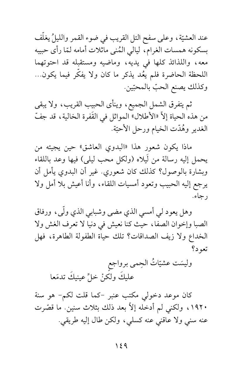 ماذا يكون شعور هذا «البدوي العاشق» حين يجيئه من يحمل إليه رسالة من لَيلاه (ولكل محب ليلى) فيها وعد باللقاء وبشارة بالوصول؟ كذلك كان شعوري. غير أن البدوي يأمل أن يرجع إليه الحبيب وتعود أمسيات اللقاء، وأنا أعيش بلا أمل ولا رجاء.