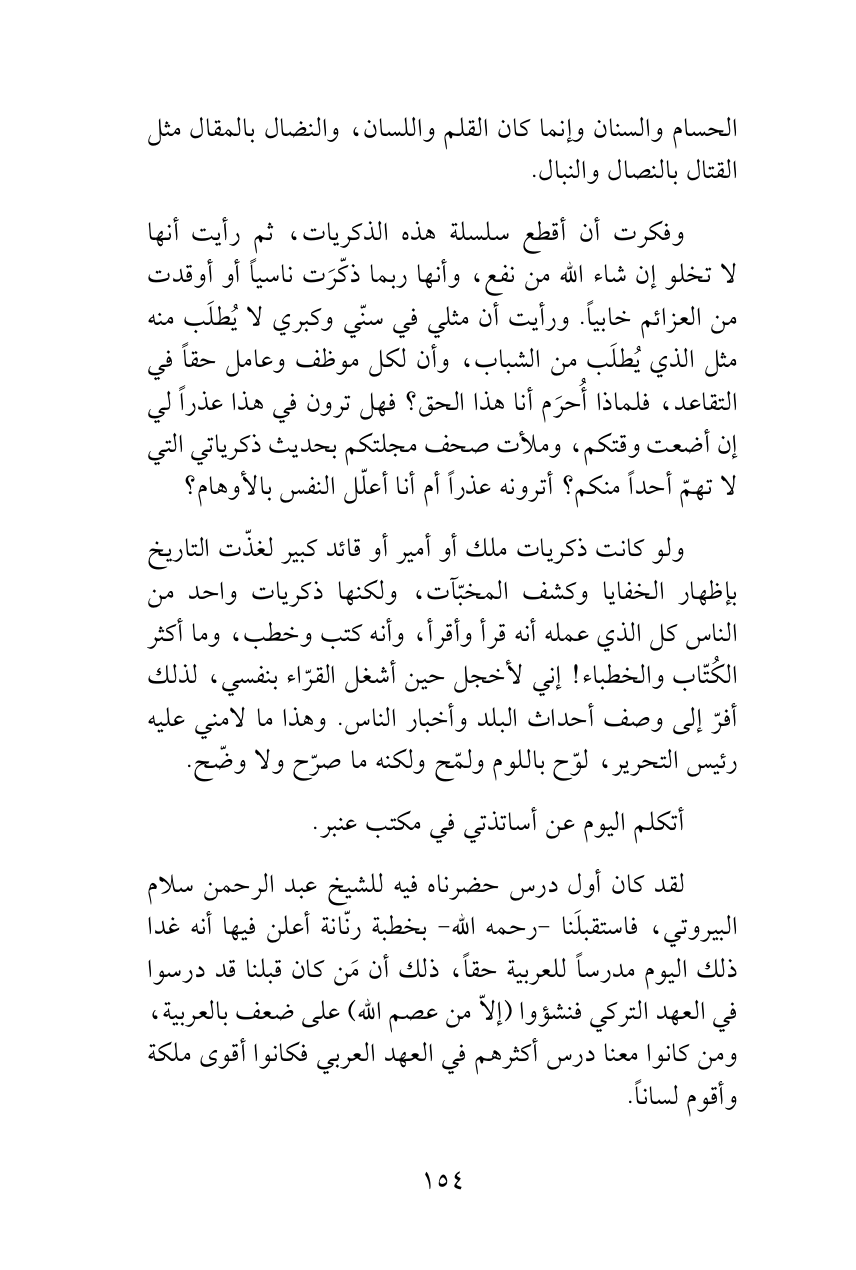 وفكرت أن أقطع سلسلة هذه الذكريات، ثم رأيت أنها لا تخلو إن شاء الله من نفع، وأنها ربما ذكّرَت ناسياً أو أوقدت من العزائم خابياً. ورأيت أن مثلي في سنّي وكبري لا يُطلَب منه مثل الذي يُطلَب من الشباب، وأن لكل موظف وعامل حقاً في التقاعد، فلماذا أُحرَم أنا هذا الحق؟ فهل ترون في هذا عذراً لي إن أضعت وقتكم، وملأت صحف مجلتكم بحديث ذكرياتي التي لا تهمّ أحداً منكم؟ أترونه عذراً أم أنا أعلّل النفس بالأوهام؟