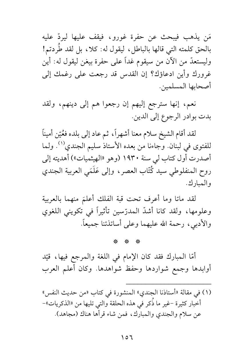 (¬1) في مقالة «أستاذنا الجندي» المنشورة في كتاب «من حديث النفس» أخبار كثيرة -غير ما ذُكر في هذه الحلقة والتي تليها من «الذكريات» - عن سلام والجندي والمبارك، فمن شاء قرأها هناك (مجاهد).