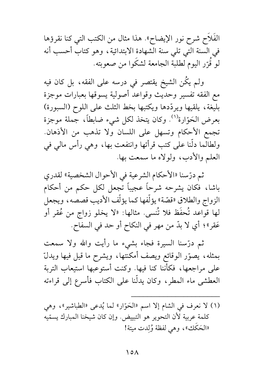 ولم يكُن الشيخ يقتصر في درسه على الفقه، بل كان فيه مع الفقه تفسير وحديث وقواعد أصولية يسوقها بعبارات موجزة بليغة، يلقيها ويردّدها ويكتبها بخط الثلث على اللوح (السبورة) بعرض الحَوّارة (¬1). وكان يتخذ لكل شيء ضابطاً، جملة موجزة تجمع الأحكام وتسهل على اللسان ولا تذهب من الأذهان. ولطالما دلّنا على كتب قرأتها وانتفعت بها، وهي رأس مالي في العلم والأدب، ولولاه ما سمعت بها.