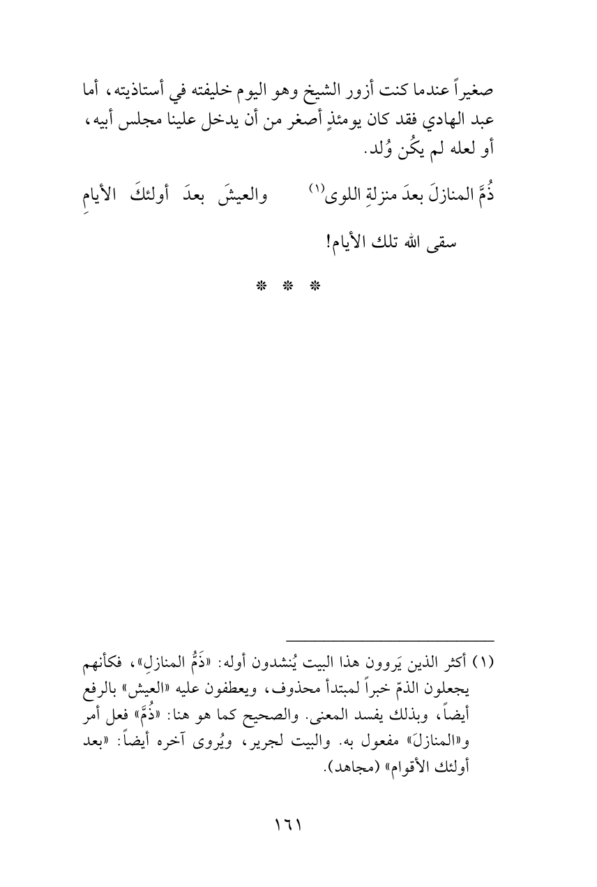 (¬1) أكثر الذين يَروون هذا البيت يُنشدون أوله: «ذَمُّ المنازلِ»، فكأنهم يجعلون الذمّ خبراً لمبتدأ محذوف، ويعطفون عليه «العيش» بالرفع أيضاً، وبذلك يفسد المعنى. والصحيح كما هو هنا: «ذُمَّ» فعل أمر و «المنازلَ» مفعول به. والبيت لجرير، ويُروى آخره أيضاً: «بعد أولئك الأقوام» (مجاهد).