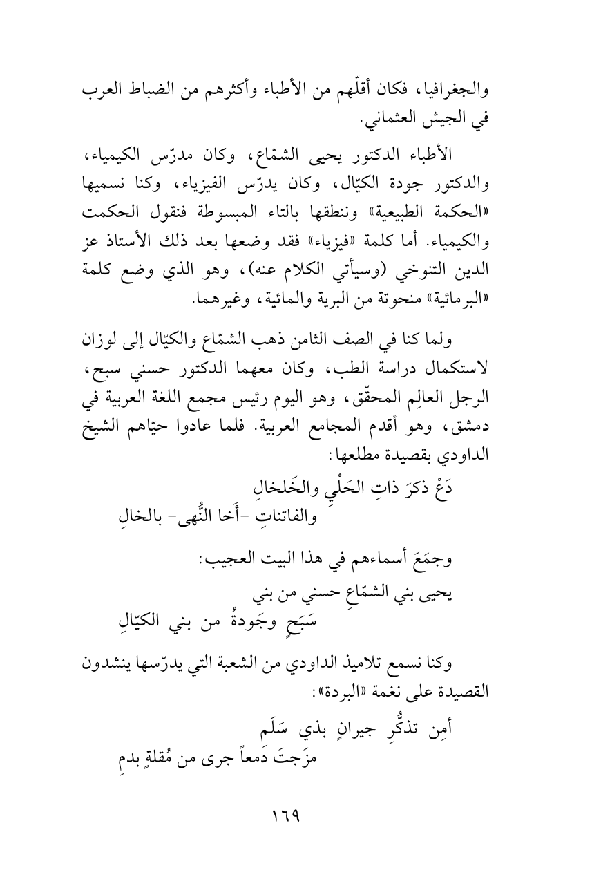الأطباء الدكتور يحيى الشمّاع، وكان مدرّس الكيمياء، والدكتور جودة الكيّال، وكان يدرّس الفيزياء، وكنا نسميها «الحكمة الطبيعية» وننطقها بالتاء المبسوطة فنقول الحكمت والكيمياء. أما كلمة «فيزياء» فقد وضعها بعد ذلك الأستاذ عز الدين التنوخي (وسيأتي الكلام عنه)، وهو الذي وضع كلمة «البرمائية» منحوتة من البرية والمائية، وغيرهما.