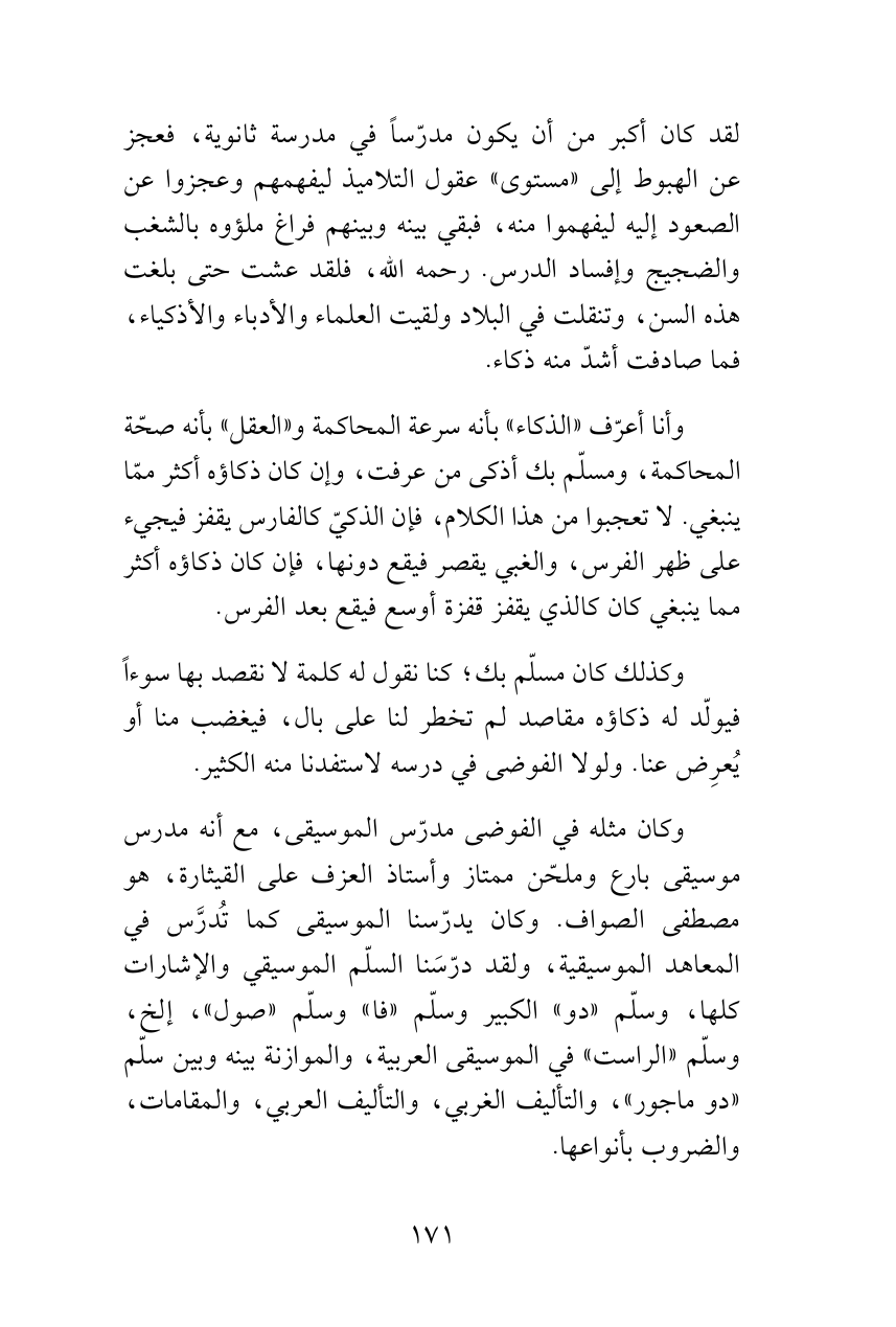 وكان مثله في الفوضى مدرّس الموسيقى، مع أنه مدرس موسيقى بارع وملحّن ممتاز وأستاذ العزف على القيثارة، هو مصطفى الصواف. وكان يدرّسنا الموسيقى كما تُدرَّس في المعاهد الموسيقية، ولقد درّسَنا السلّم الموسيقي والإشارات كلها، وسلّم «دو» الكبير وسلّم «فا» وسلّم «صول»، إلخ، وسلّم «الراست» في الموسيقى العربية، والموازنة بينه وبين سلّم «دو ماجور»، والتأليف الغربي، والتأليف العربي، والمقامات، والضروب بأنواعها.