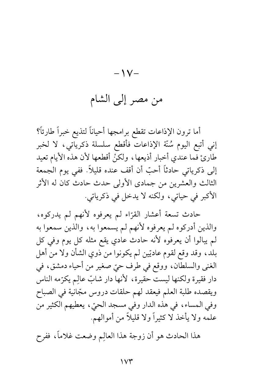 أما ترون الإذاعات تقطع برامجها أحياناً لتذيع خبراً طارئاً؟ إني أتبع اليوم سُنّة الإذاعات فأقطع سلسلة ذكرياتي، لا لخبر طارئ فما عندي أخبار أذيعها، ولكنْ أقطعها لأن هذه الأيام تعيد إلى ذكرياتي حادثاً أحبّ أن أقف عنده قليلاً. ففي يوم الجمعة الثالث والعشرين من جمادى الأولى حدث حادث كان له الأثر الأكبر في حياتي، ولكنه لا يدخل في ذكرياتي.