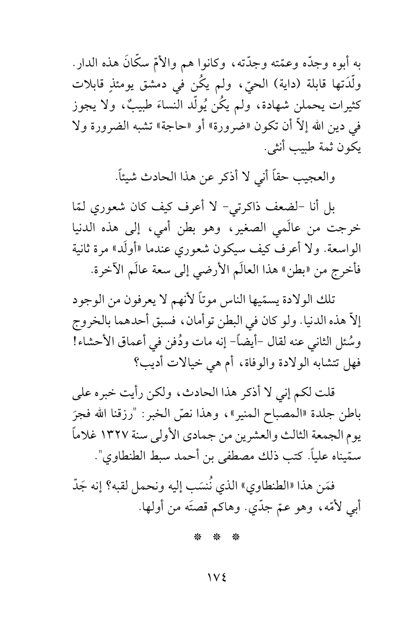 بل أنا -لضعف ذاكرتي- لا أعرف كيف كان شعوري لمّا خرجت من عالَمي الصغير، وهو بطن أمي، إلى هذه الدنيا الواسعة. ولا أعرف كيف سيكون شعوري عندما «أولَد» مرة ثانية فأخرج من «بطن» هذا العالَم الأرضي إلى سعة عالَم الآخرة.