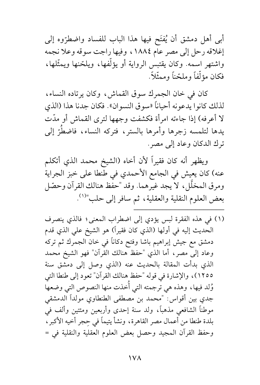 (¬1) في هذه الفقرة لبس يؤدي إلى اضطراب المعنى؛ فالذي ينصرف الحديث إليه في أولها (الذي كان فقيراً) هو الشيخ علي الذي قدم دمشق مع جيش إبراهيم باشا وفتح دكاناً في خان الجمرك ثم تركه وعاد إلى مصر، أما الذي "حفظ هنالك القرآن" فهو الشيخ محمد الذي بدأت المقالة بالحديث عنه (الذي وصل إلى دمشق سنة 1255)، والإشارة في قوله "حفظ هنالك القرآن" تعود إلى طنطا التي وُلد فيها، وهذه هي ترجمته التي أُخذت منها النصوص التي وضعها جدي بين أقواس: "محمد بن مصطفى الطنطاوي مولداً الدمشقي موطناً الشافعي مذهباً، ولد سنة إحدى وأربعين ومئتين وألف في بلدة طنطا من أعمال مصر القاهرة، ونشأ يتيماً في حِجر أخيه الأكبر، وحفظ القرآن المجيد وحصل بعض العلوم العقلية والنقلية في =