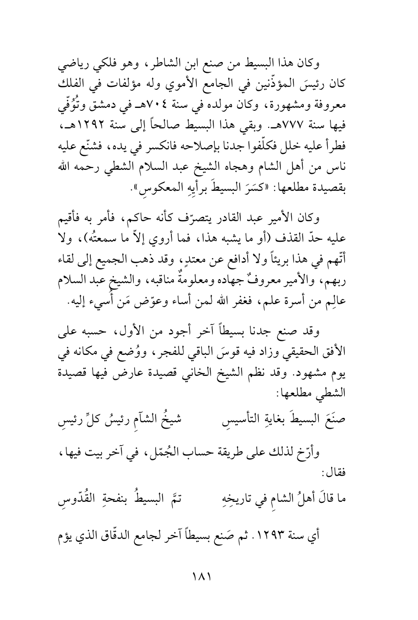 وكان هذا البسيط من صنع ابن الشاطر، وهو فلكي رياضي كان رئيسَ المؤذّنين في الجامع الأموي وله مؤلفات في الفلك معروفة ومشهورة، وكان مولده في سنة 704هـ في دمشق وتُوُفّي فيها سنة 777هـ. وبقي هذا البسيط صالحاً إلى سنة 1292هـ، فطرأ عليه خلل فكلّفوا جدنا بإصلاحه فانكسر في يده، فشنّع عليه ناس من أهل الشام وهجاه الشيخ عبد السلام الشطي رحمه الله بقصيدة مطلعها: «كسَرَ البسيطَ برأيِهِ المعكوسِ».