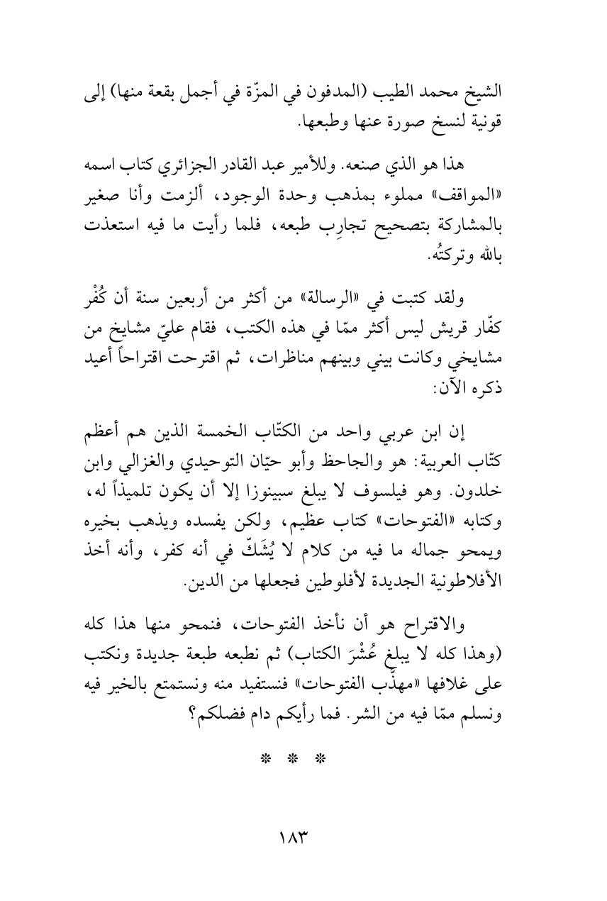 هذا هو الذي صنعه. وللأمير عبد القادر الجزائري كتاب اسمه «المواقف» مملوء بمذهب وحدة الوجود، ألزمت وأنا صغير بالمشاركة بتصحيح تجارِب طبعه، فلما رأيت ما فيه استعذت بالله وتركتُه.