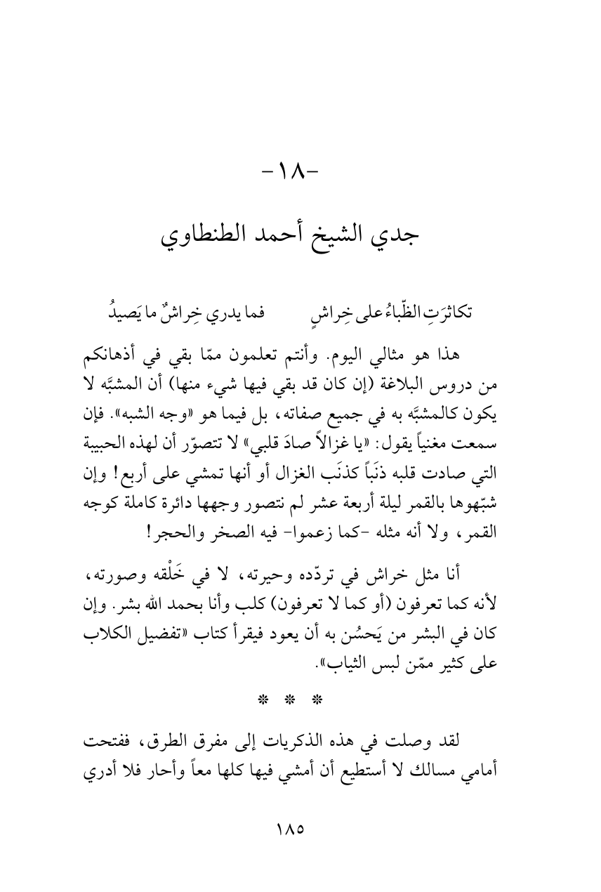 هذا هو مثالي اليوم. وأنتم تعلمون ممّا بقي في أذهانكم من دروس البلاغة (إن كان قد بقي فيها شيء منها) أن المشبَّه لا يكون كالمشبَّه به في جميع صفاته، بل فيما هو «وجه الشبه». فإن سمعت مغنياً يقول: «يا غزالاً صادَ قلبي» لا تتصوّر أن لهذه الحبيبة التي صادت قلبه ذنَباً كذنَب الغزال أو أنها تمشي على أربع! وإن شبّهوها بالقمر ليلة أربعة عشر لم نتصور وجهها دائرة كاملة كوجه القمر، ولا أنه مثله -كما زعموا- فيه الصخر والحجر!