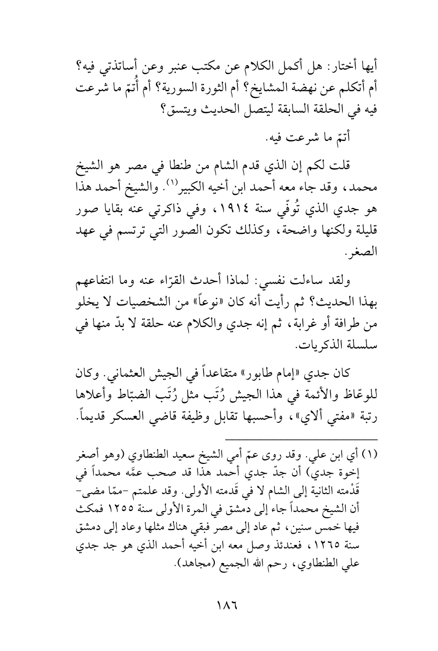 (¬1) أي ابن علي. وقد روى عمّ أمي الشيخ سعيد الطنطاوي (وهو أصغر إخوة جدي) أن جدّ جدي أحمد هذا قد صحب عمَّه محمداً في قَدْمته الثانية إلى الشام لا في قَدمته الأولى. وقد علمتم -ممّا مضى- أن الشيخ محمداً جاء إلى دمشق في المرة الأولى سنة 1255 فمكث فيها خمس سنين، ثم عاد إلى مصر فبقي هناك مثلها وعاد إلى دمشق سنة 1265، فعندئذ وصل معه ابن أخيه أحمد الذي هو جد جدي علي الطنطاوي، رحم الله الجميع (مجاهد).