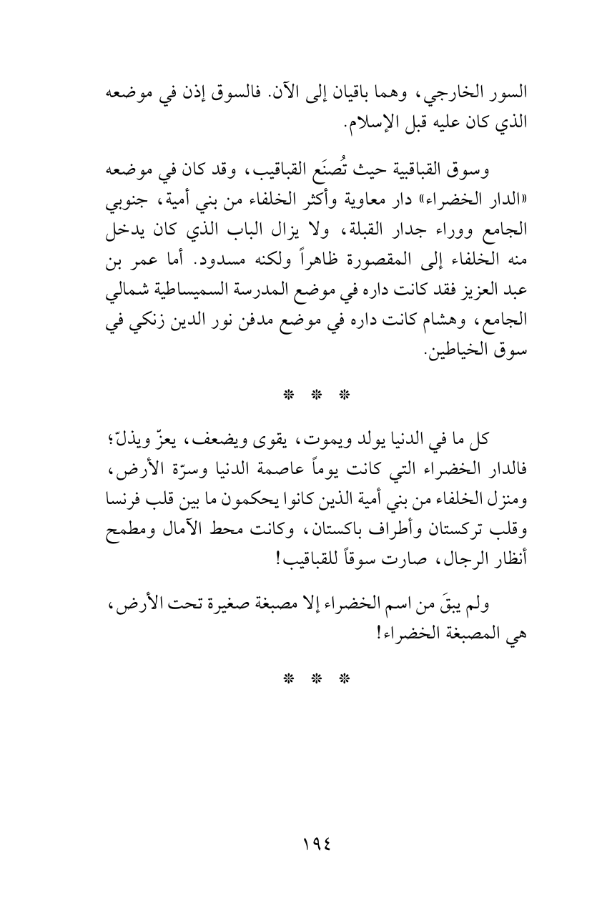كل ما في الدنيا يولد ويموت، يقوى ويضعف، يعزّ ويذلّ؛ فالدار الخضراء التي كانت يوماً عاصمة الدنيا وسرّة الأرض، ومنزل الخلفاء من بني أمية الذين كانوا يحكمون ما بين قلب فرنسا وقلب تركستان وأطراف باكستان، وكانت محط الآمال ومطمح أنظار الرجال، صارت سوقاً للقباقيب!