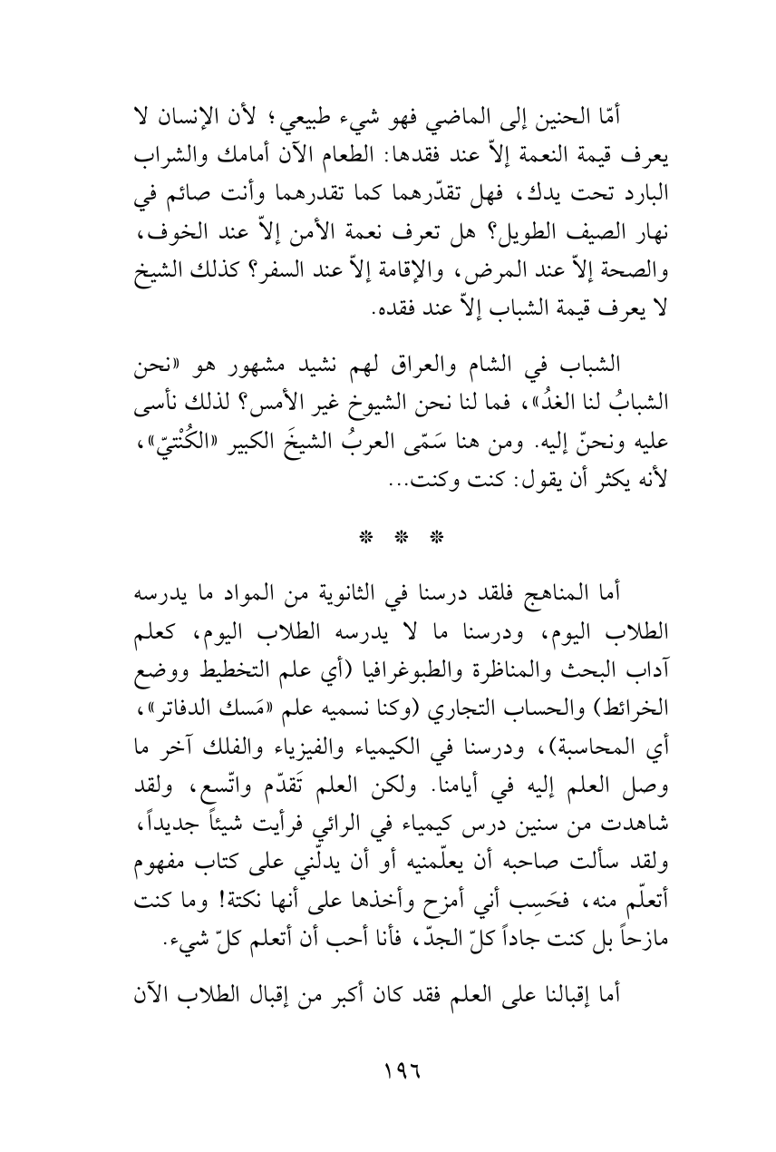 أمّا الحنين إلى الماضي فهو شيء طبيعي؛ لأن الإنسان لا يعرف قيمة النعمة إلاّ عند فقدها: الطعام الآن أمامك والشراب البارد تحت يدك، فهل تقدّرهما كما تقدرهما وأنت صائم في نهار الصيف الطويل؟ هل تعرف نعمة الأمن إلاّ عند الخوف، والصحة إلاّ عند المرض، والإقامة إلاّ عند السفر؟ كذلك الشيخ لا يعرف قيمة الشباب إلاّ عند فقده.