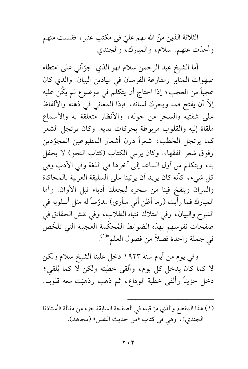 (¬1) هذا المقطع والذي مرّ قبله في الصفحة السابقة جزء من مقالة «أستاذنا الجندي»، وهي في كتاب «من حديث النفس» (مجاهد).