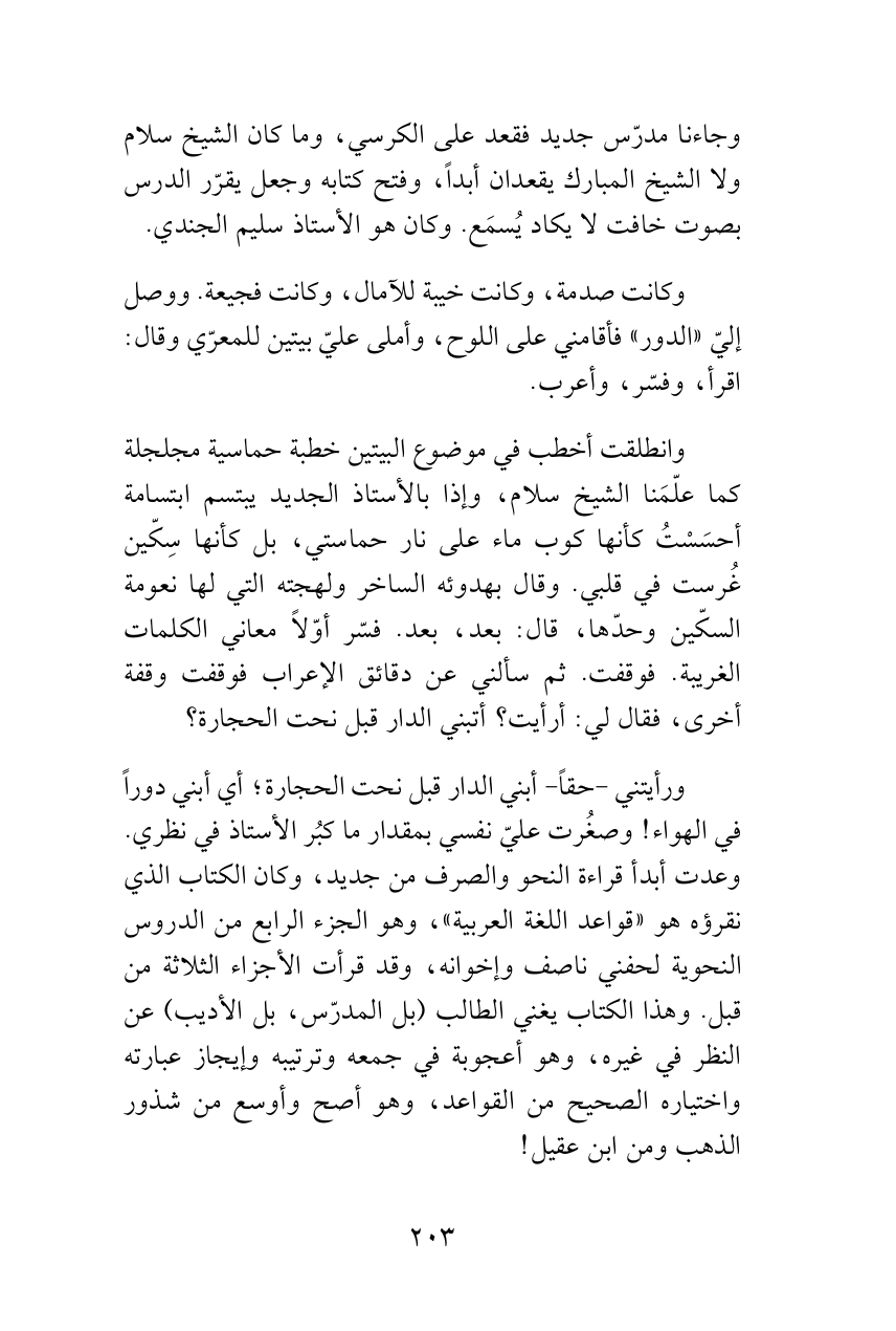 وانطلقت أخطب في موضوع البيتين خطبة حماسية مجلجلة كما علّمَنا الشيخ سلام، وإذا بالأستاذ الجديد يبتسم ابتسامة أحسَسْتُ كأنها كوب ماء على نار حماستي، بل كأنها سِكّين غُرست في قلبي. وقال بهدوئه الساخر ولهجته التي لها نعومة السكّين وحدّها، قال: بعد، بعد. فسّر أوّلاً معاني الكلمات الغريبة. فوقفت. ثم سألني عن دقائق الإعراب فوقفت وقفة أخرى، فقال لي: أرأيت؟ أتبني الدار قبل نحت الحجارة؟