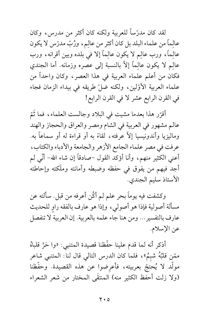 أقرّر هذا بعدما مشيت في البلاد وجالست العلماء، فما ثَمّ عالم مشهور في العربية في الشام ومصر والعراق والحجاز والهند وماليزيا وأندونيسيا إلاّ عرفته، لقاءً به أو قراءة له أو سماعاً به. عرفت في مصر علماء الجامع الأزهر والجامعة والأدباء والكتاب، أعني الكثير منهم، وأنا أؤكد القول -صادقاً إن شاء الله- أنّي لم أجد فيهم من يفوق في حفظه وضبطه وأمانته وملَكته وإحاطته الأستاذ سليم الجندي.