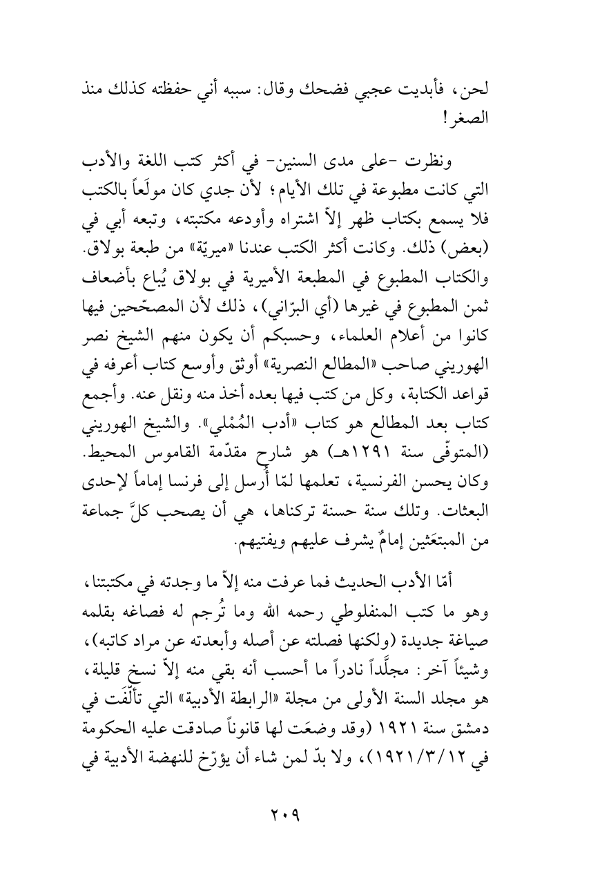 ونظرت -على مدى السنين- في أكثر كتب اللغة والأدب التي كانت مطبوعة في تلك الأيام؛ لأن جدي كان مولَعاً بالكتب فلا يسمع بكتاب ظهر إلاّ اشتراه وأودعه مكتبته، وتبعه أبي في (بعض) ذلك. وكانت أكثر الكتب عندنا «ميريّة» من طبعة بولاق. والكتاب المطبوع في المطبعة الأميرية في بولاق يُباع بأضعاف ثمن المطبوع في غيرها (أي البرّاني)، ذلك لأن المصحّحين فيها كانوا من أعلام العلماء، وحسبكم أن يكون منهم الشيخ نصر الهوريني صاحب «المطالع النصرية» أوثق وأوسع كتاب أعرفه في قواعد الكتابة، وكل من كتب فيها بعده أخذ منه ونقل عنه. وأجمع كتاب بعد المطالع هو كتاب «أدب المُمْلي». والشيخ الهوريني (المتوفّى سنة 1291هـ) هو شارح مقدّمة القاموس المحيط. وكان يحسن الفرنسية، تعلمها لمّا أُرسل إلى فرنسا إماماً لإحدى البعثات. وتلك سنة حسنة تركناها، هي أن يصحب كلَّ جماعة من المبتعَثين إمامٌ يشرف عليهم ويفتيهم.