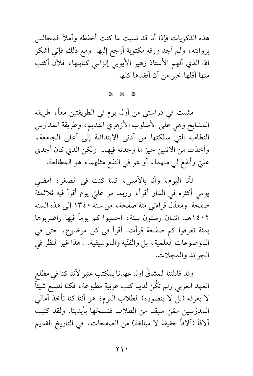 مشيت في دراستي من أول يوم في الطريقتين معاً، طريقة المشايخ وهي على الأسلوب الأزهري القديم، وطريقة المدارس النظامية التي سلكتها من أدنى الابتدائية إلى أعلى الجامعة، وأخذت من الاثنين خيرَ ما وجدته فيهما. ولكن الذي كان أجدى عليّ وأنفع لي منهما، أو هو في النفع مثلهما، هو المطالعة.
