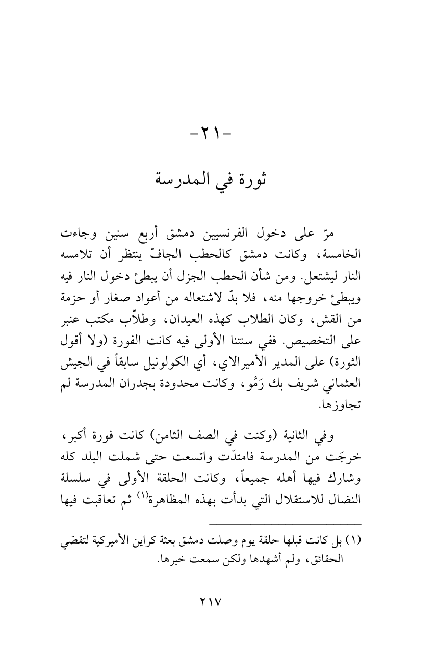 وفي الثانية (وكنت في الصف الثامن) كانت فورة أكبر، خرجَت من المدرسة فامتدّت واتسعت حتى شملت البلد كله وشارك فيها أهله جميعاً، وكانت الحلقة الأولى في سلسلة النضال للاستقلال التي بدأت بهذه المظاهرة (¬1) ثم تعاقبت فيها