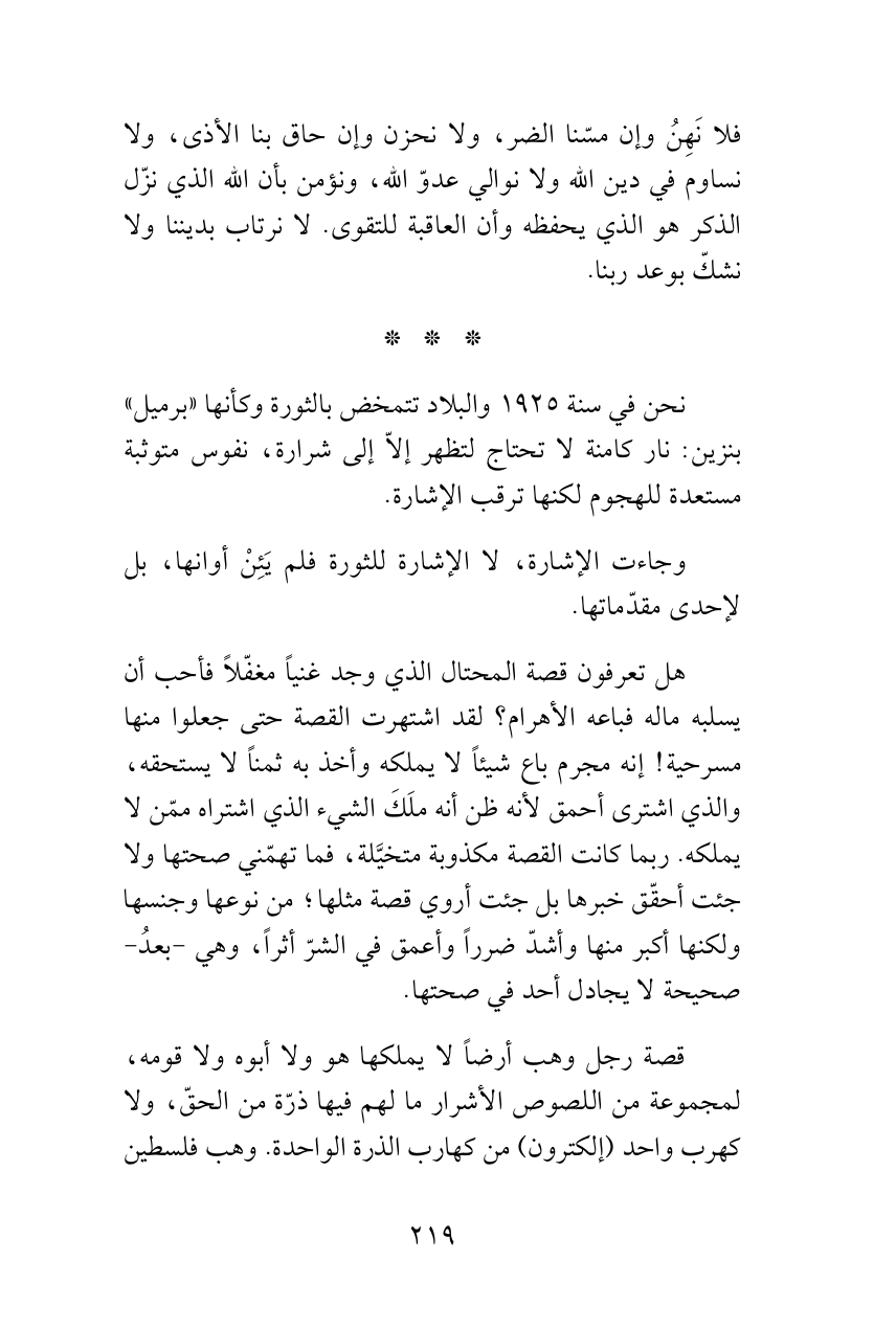 نحن في سنة 1925 والبلاد تتمخض بالثورة وكأنها «برميل» بنزين: نار كامنة لا تحتاج لتظهر إلاّ إلى شرارة، نفوس متوثبة مستعدة للهجوم لكنها ترقب الإشارة.